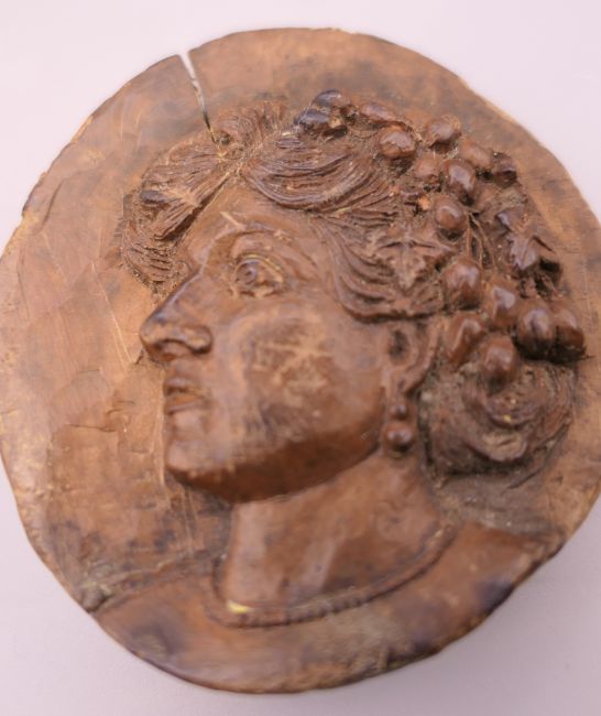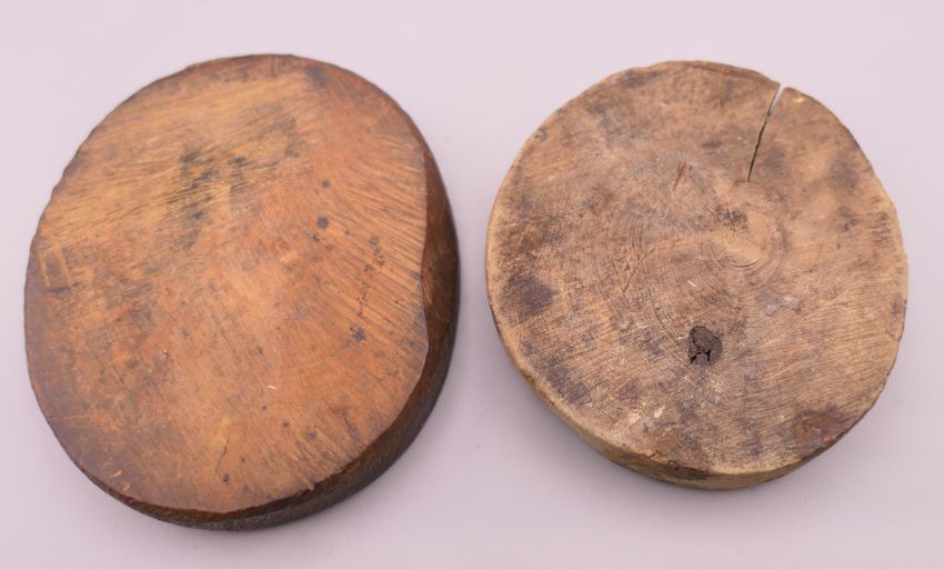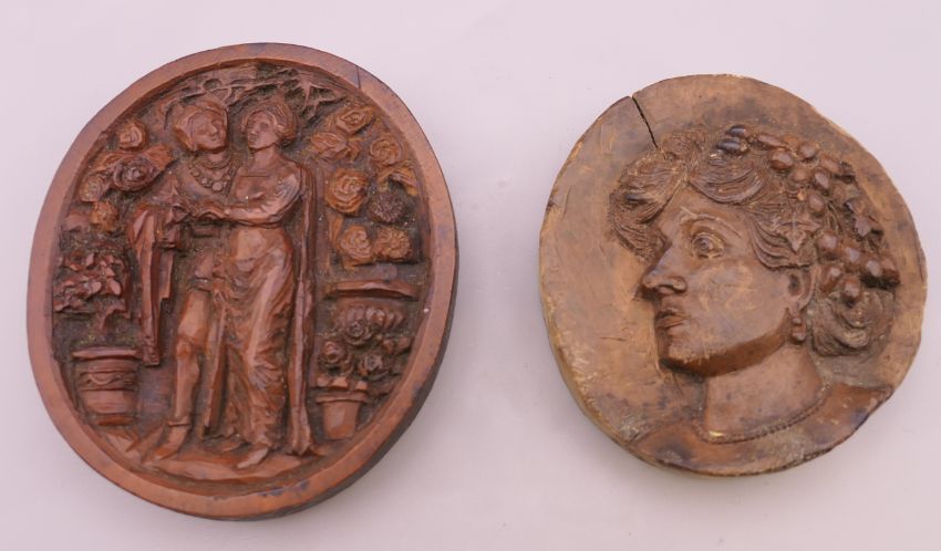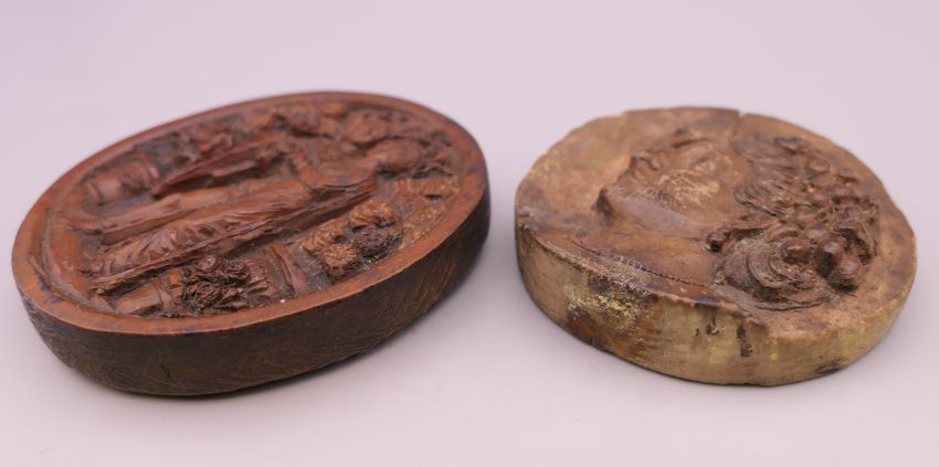 Two carved wooden roundels. 7.5 cm high and 6.25 cm high respectively.
