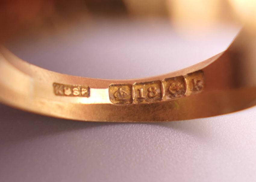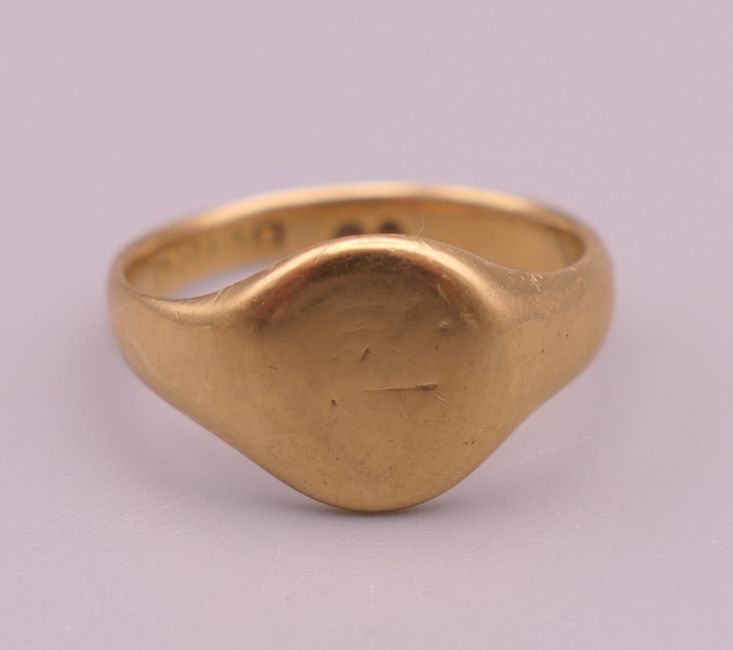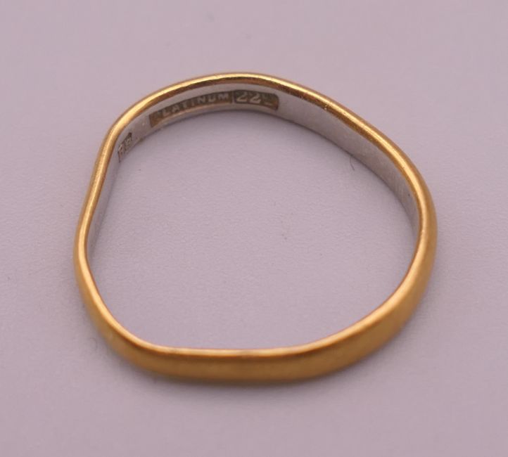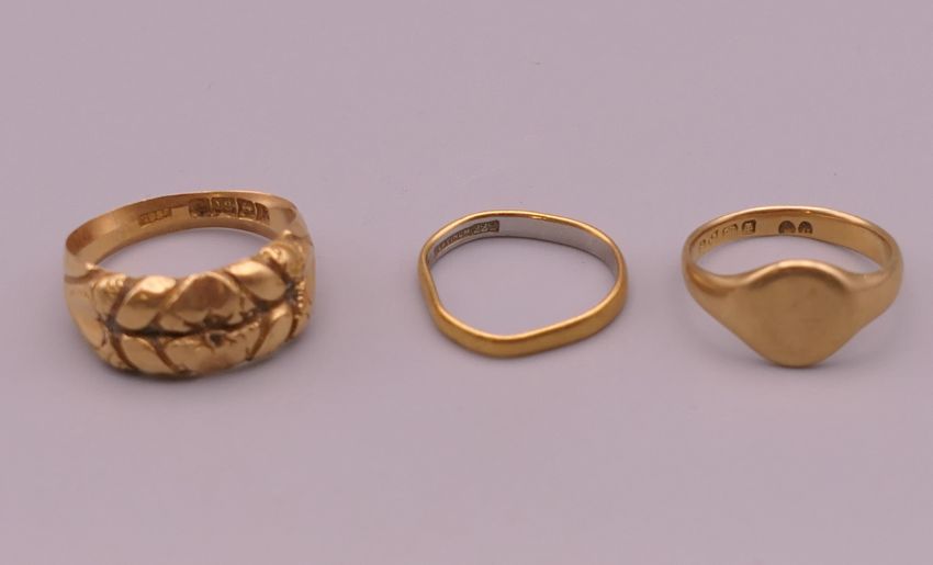 A platinum and 22 ct gold wedding band (2 grammes) together with two 18 ct gold rings (8.7 grammes).