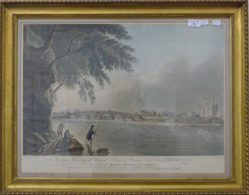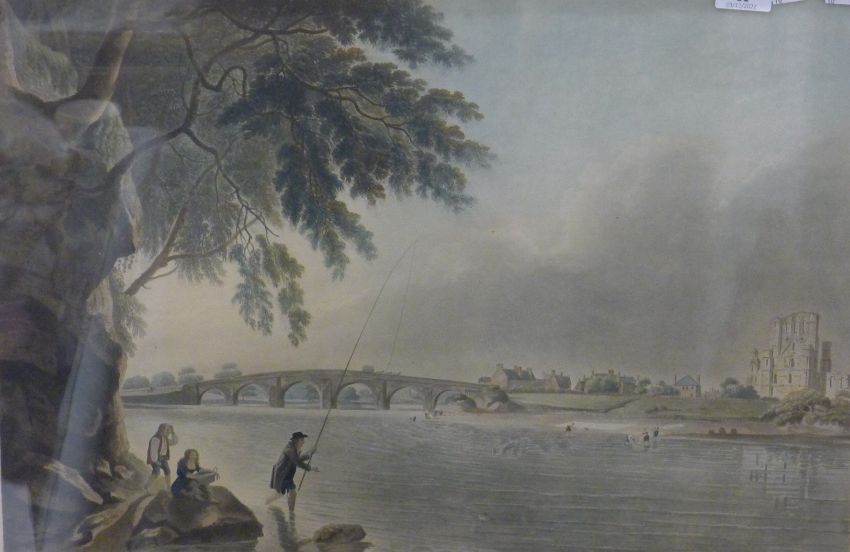 FRANCIS JUKES (1747-1812) British, engraving After CHARLES CATTON JNR, To His Grace John Duke of Roxburgh, Marquis of Beamont, Earl Kerr of Wakefield &c &c This View of Kelso Bridge and Abbey, published 1793, framed and glazed. 60.5 x 45 cm.