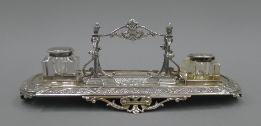 A Victorian silver plated desk stand, with associated inkwells. 32.5 cm long.