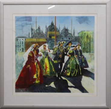 STAN SMITH, Carnival in Venice, limited edition print, signed in pencil to margin, numbered 45/95, framed and glazed. 65 x 63 cm.