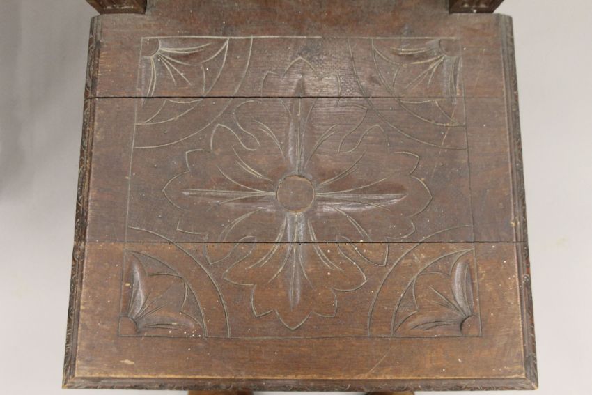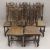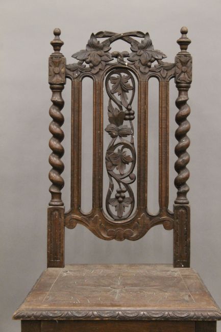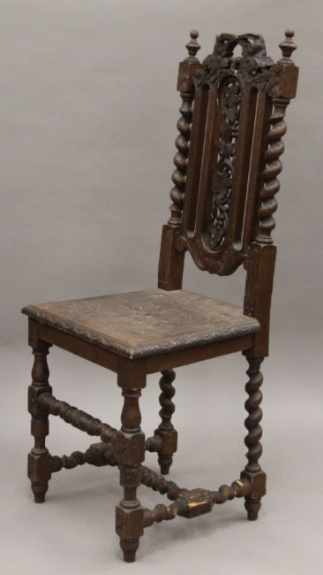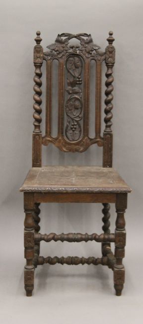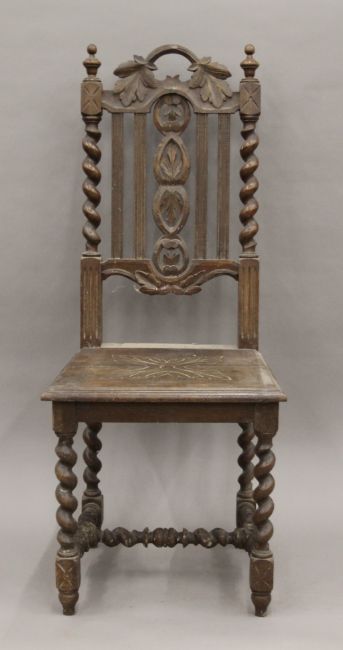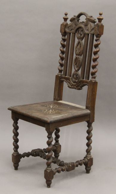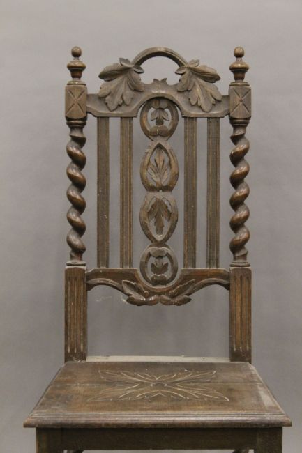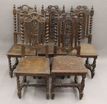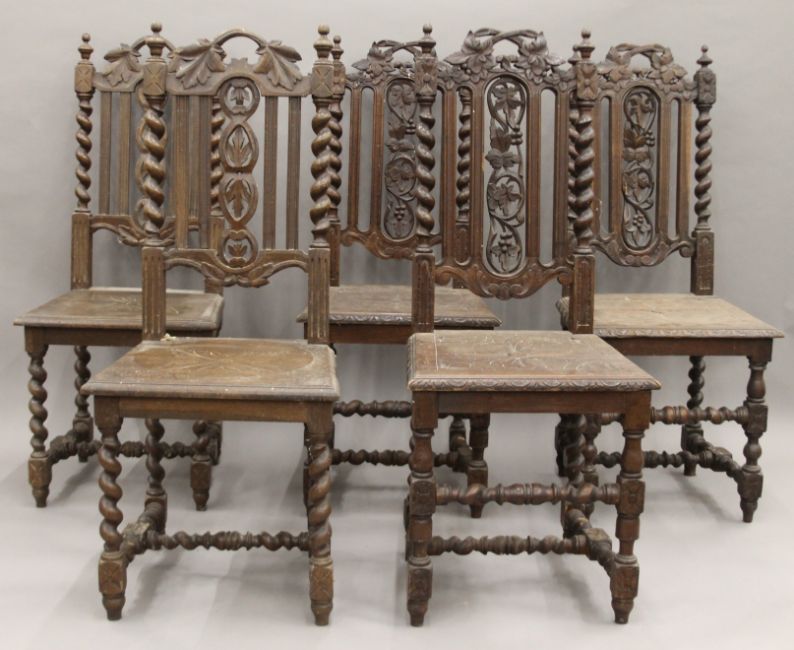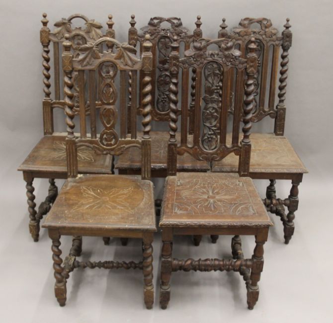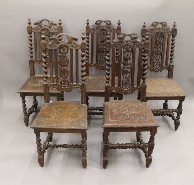 Five various carved oak barley twist chairs.