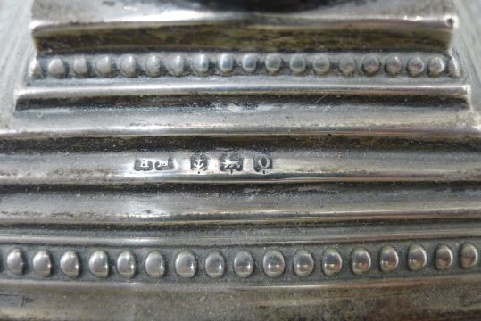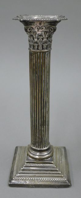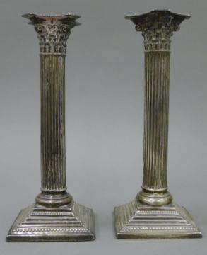 A pair of Corinthian column silver candlesticks. 23 cm high.