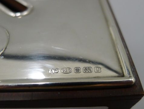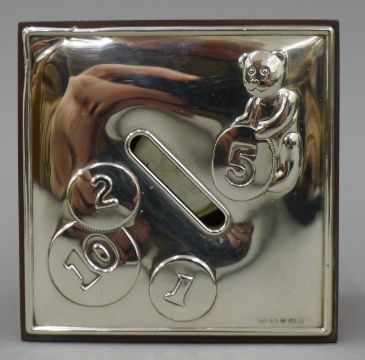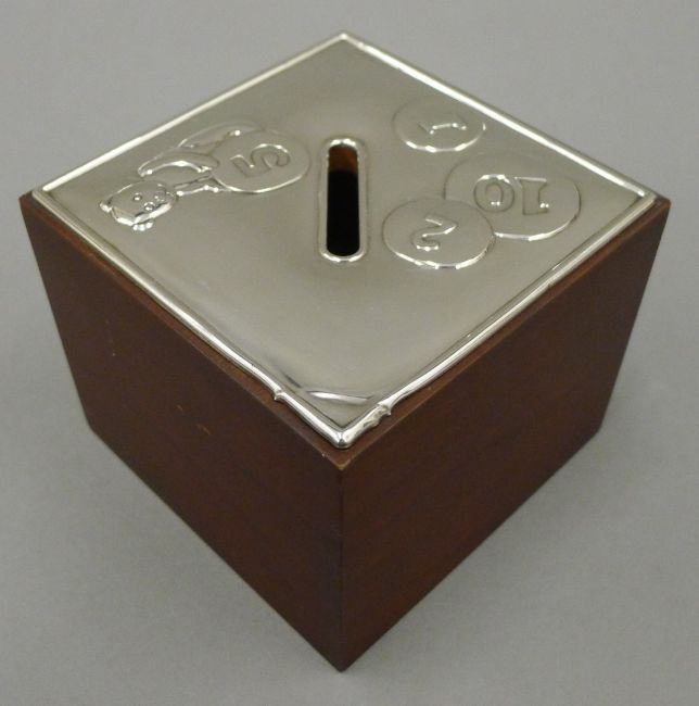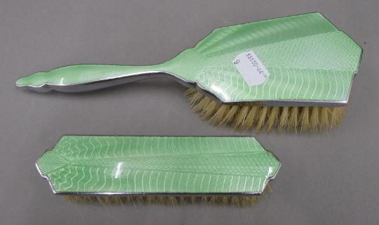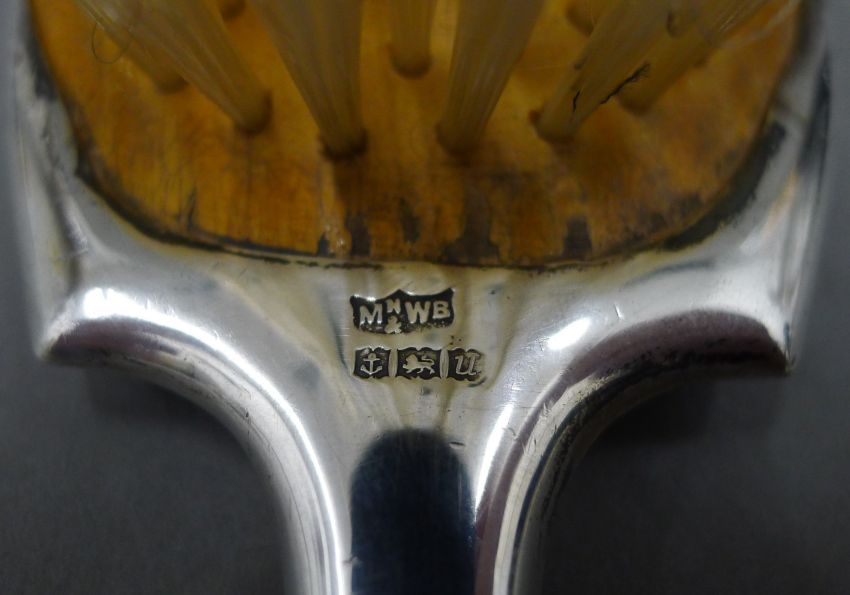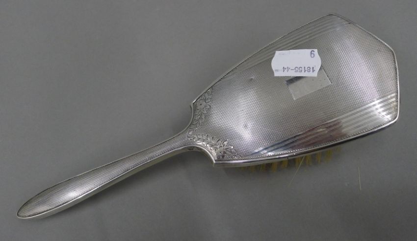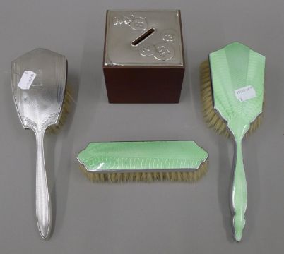 A silver top money box, a silver brush and two other brushes. The former 7.5 cm high.