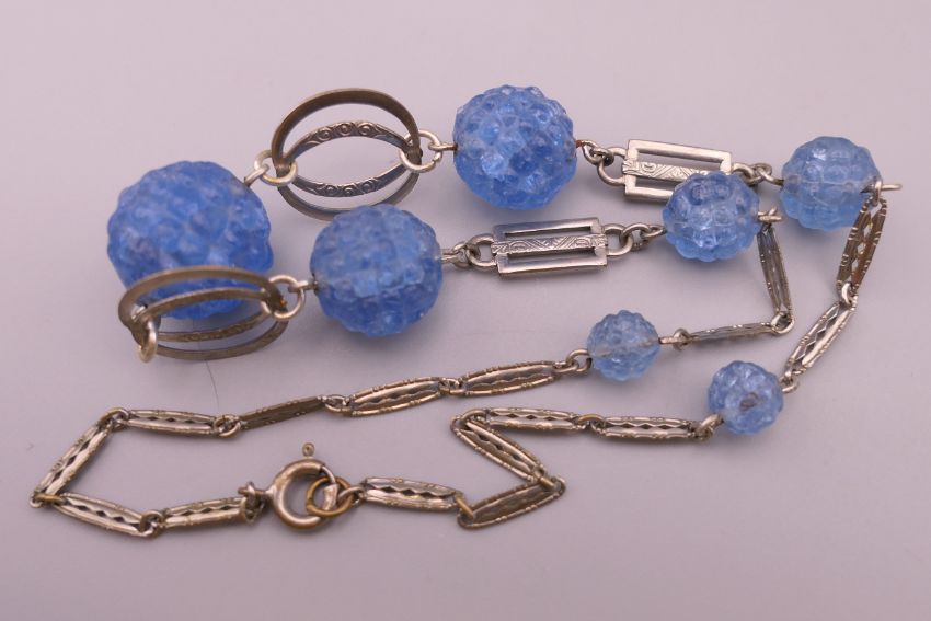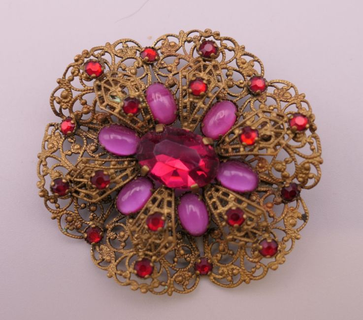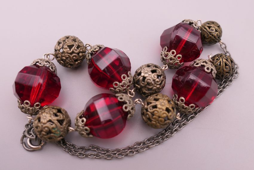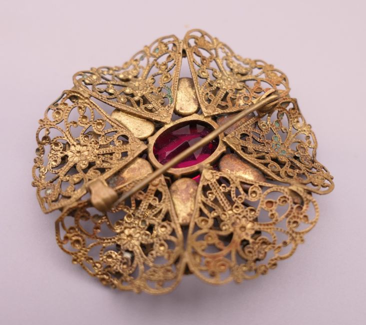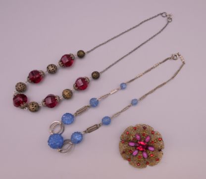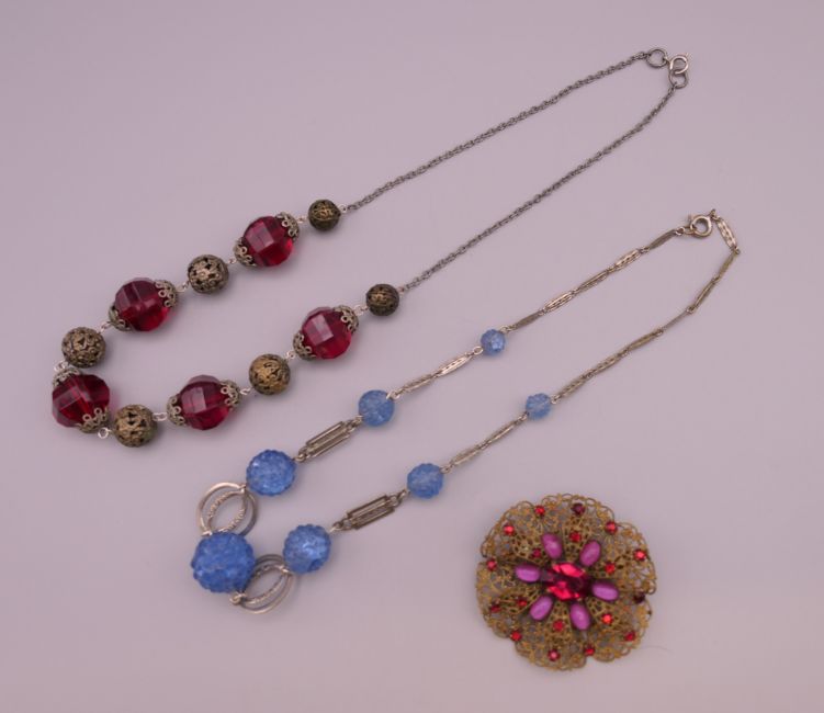 Two vintage necklaces and a brooch. Brooch 5 cm diameter, red bead necklace approximately 45 cm long.