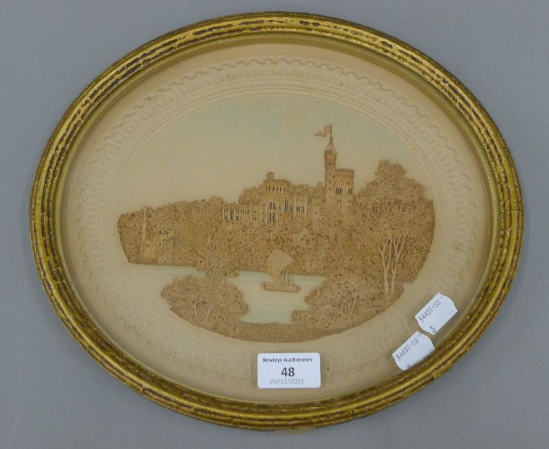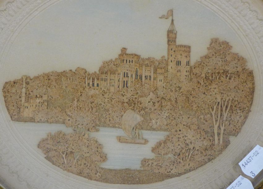A Victorian cork picture, depicting a castle, oval framed. 31.5 cm wide overall.