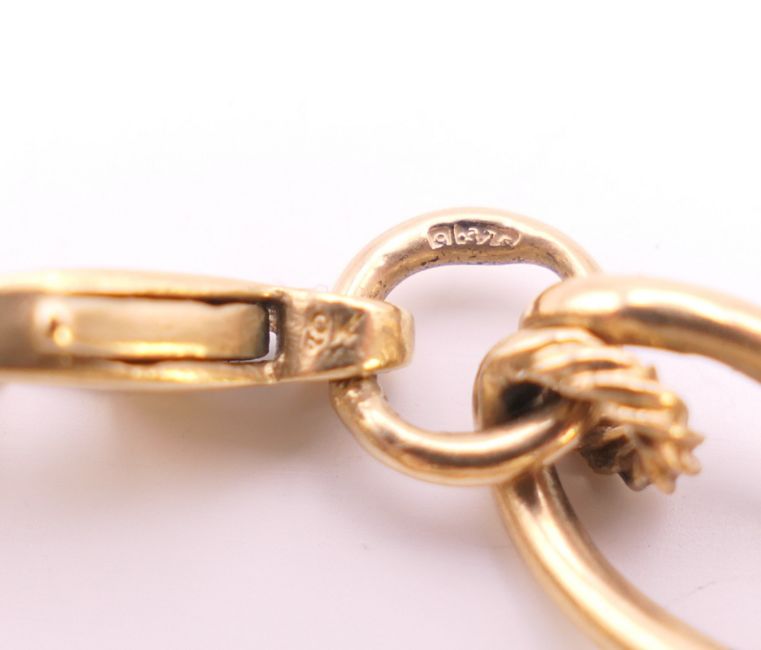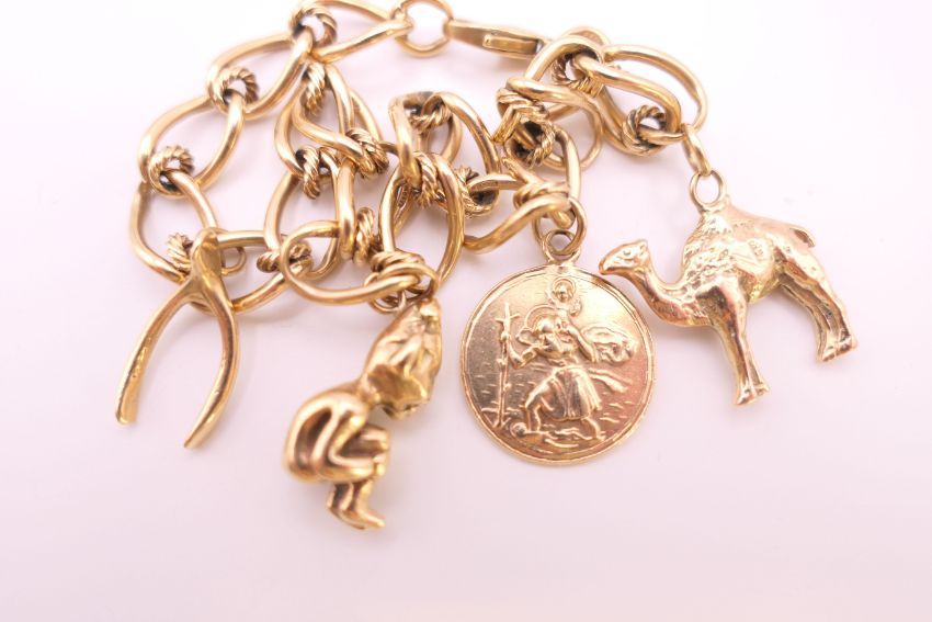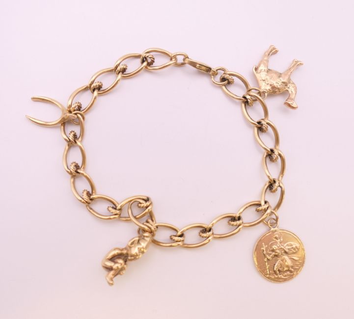 A 9 ct gold charm bracelet. 21 cm long. 25.7 grammes.