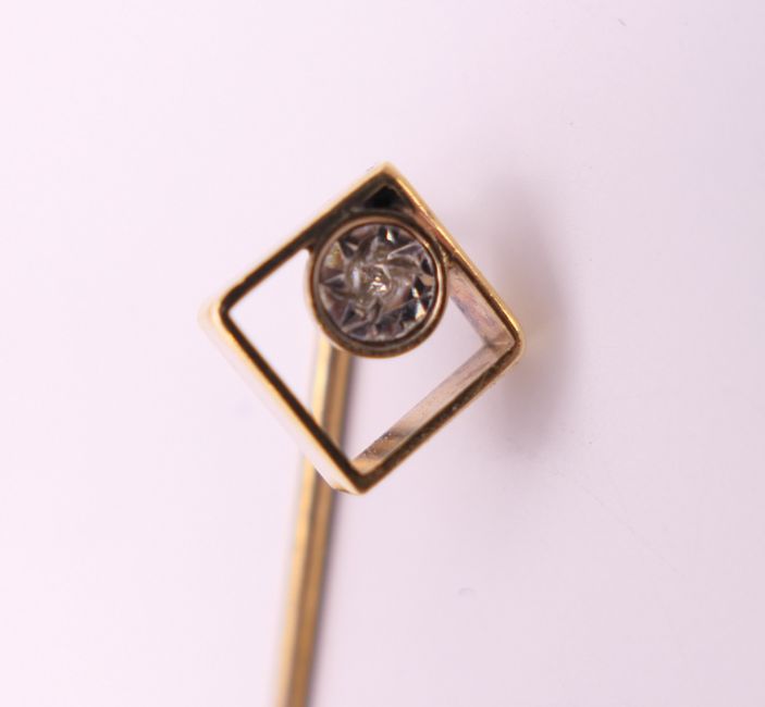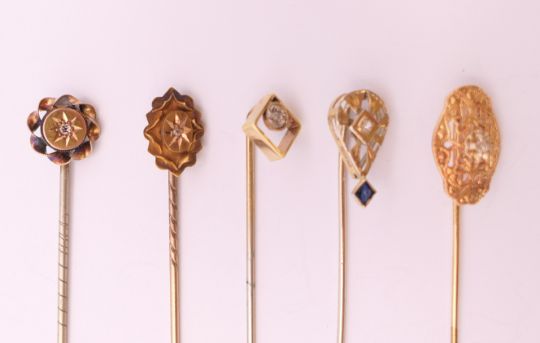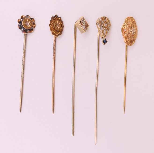 Five various diamond set stickpins. Largest 6.5 cm long.