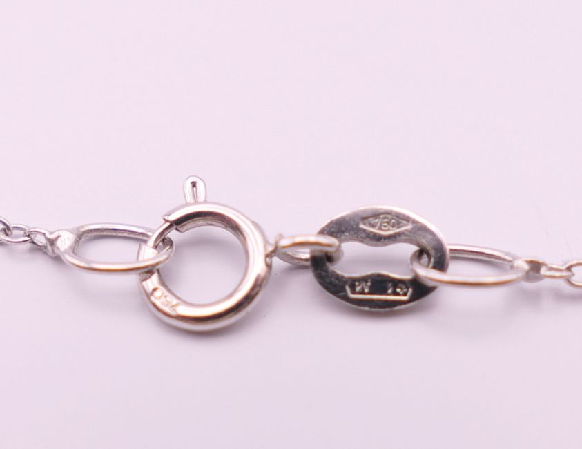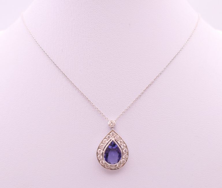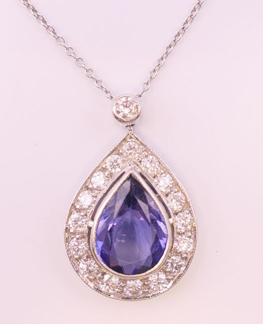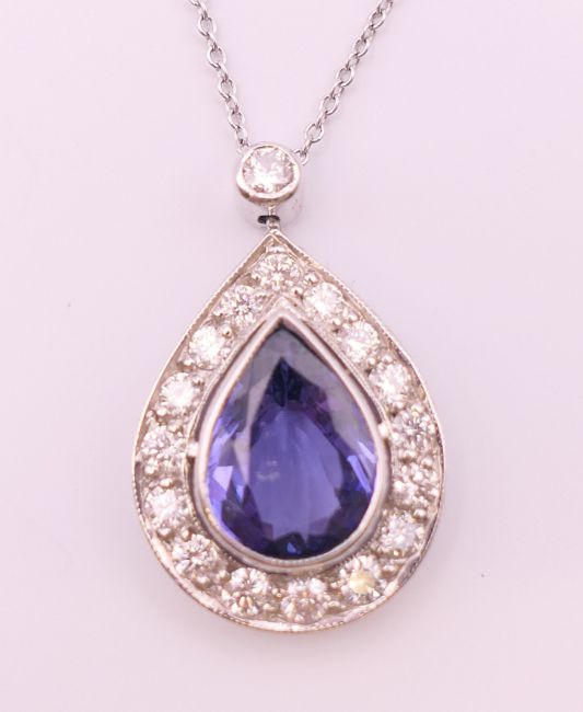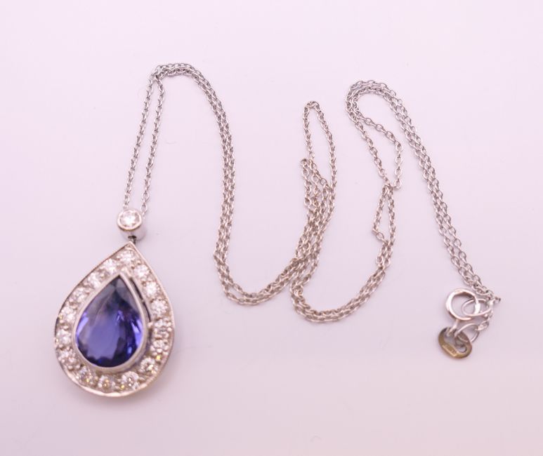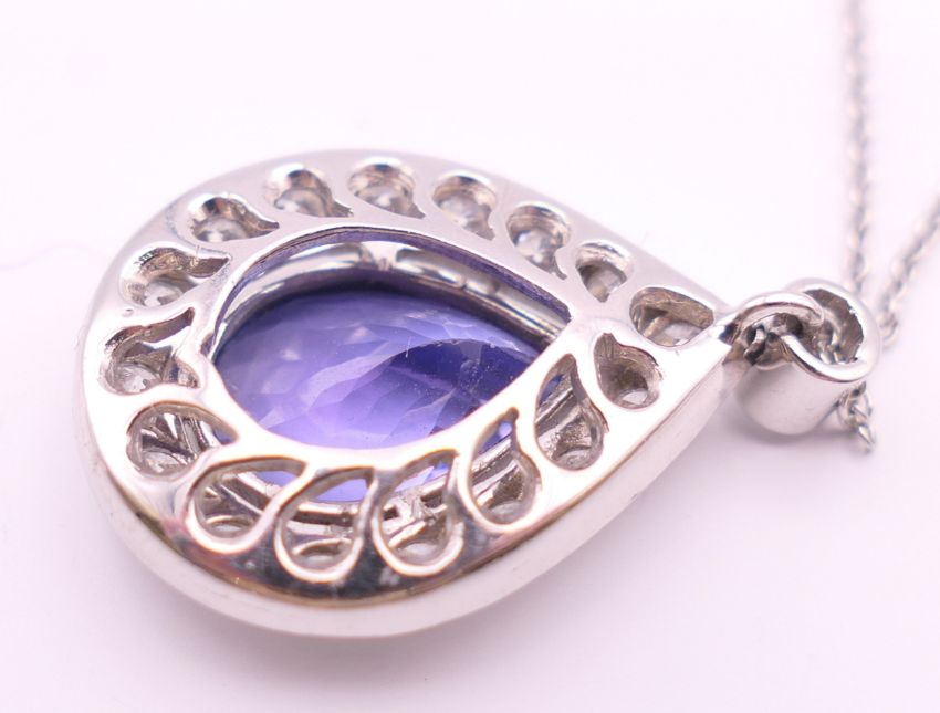 An 18 ct white gold pear shape tanzanite and diamond pendant on chain. Pendant 2.5 cm high including suspension loop, chain 41 cm long. 4.5 grammes total weight.
