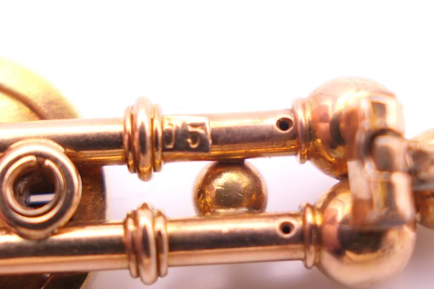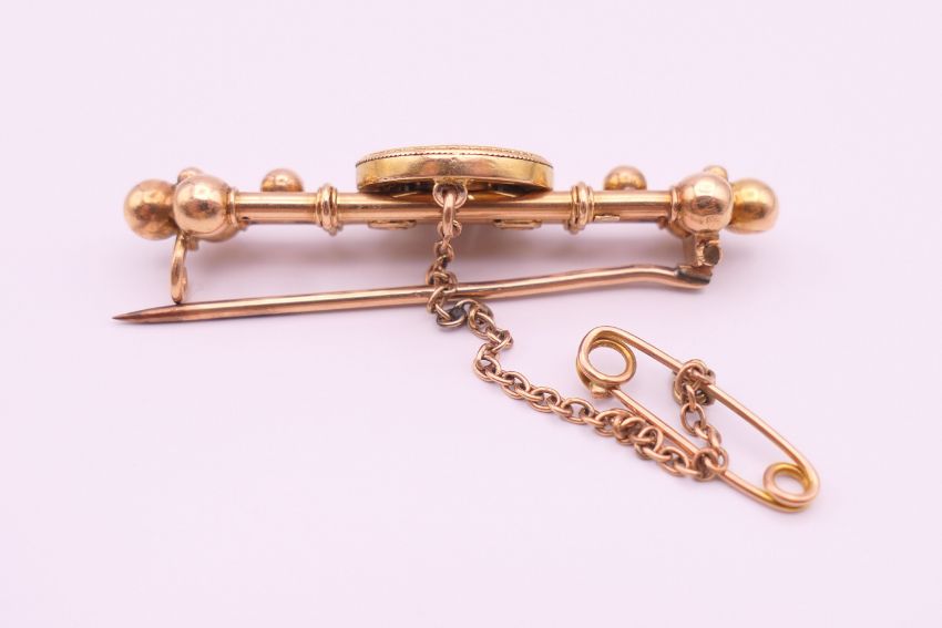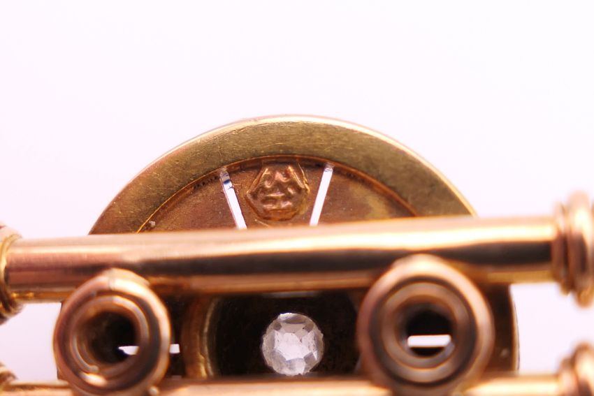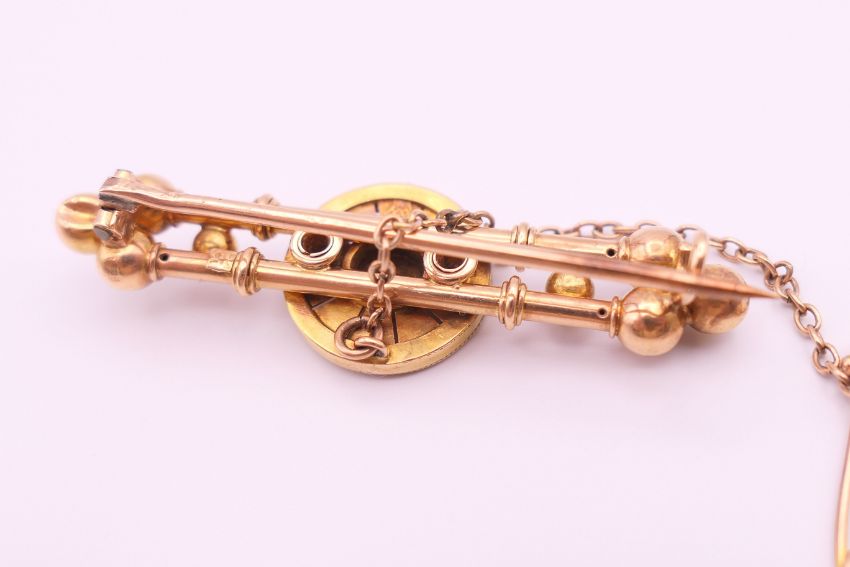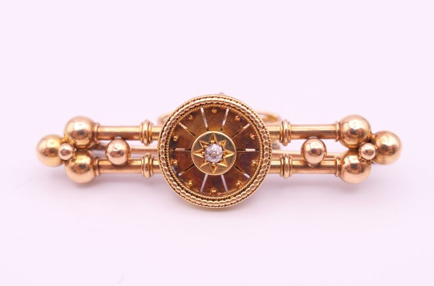 A 15 ct gold and diamond brooch. 5 cm long. 6.9 grammes total weight.