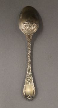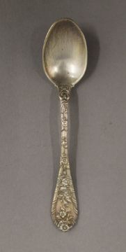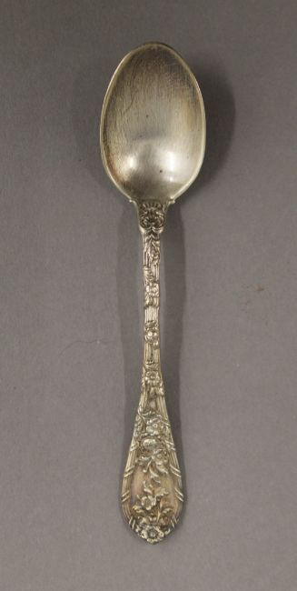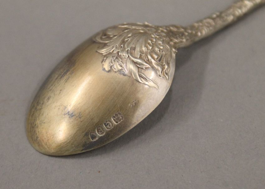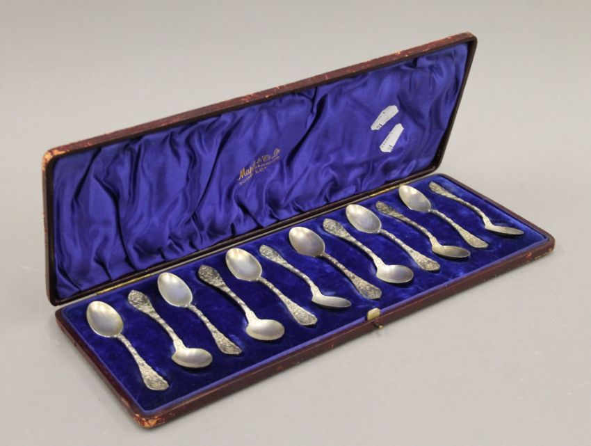 A cased set of twelve silver teaspoons, in Maple & Co box. 165.5 grammes.