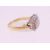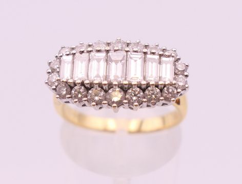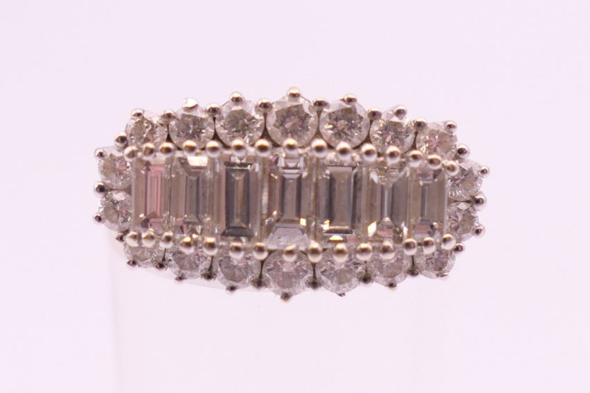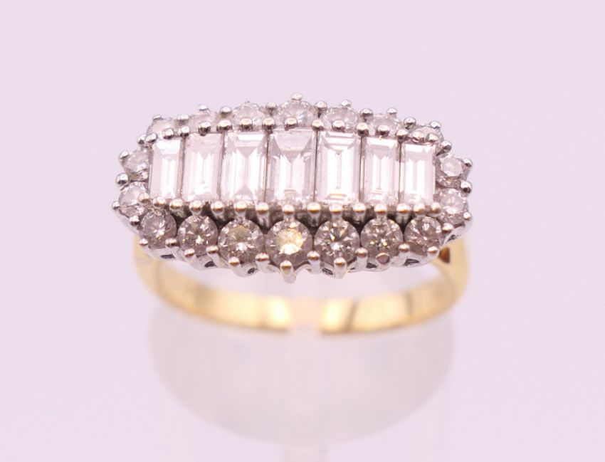 An 18 ct gold ring with row of baguette diamonds surrounded with brilliant cut diamonds. Total diamond weight approximately 1.3 carats. Ring size N.