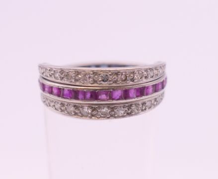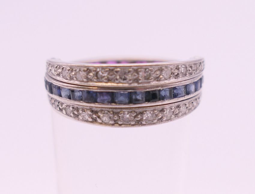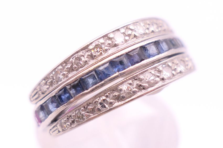 A white metal (possibly platinum) diamond, ruby and sapphire night and day ring. Ring size M. 4.7 grammes total weight.