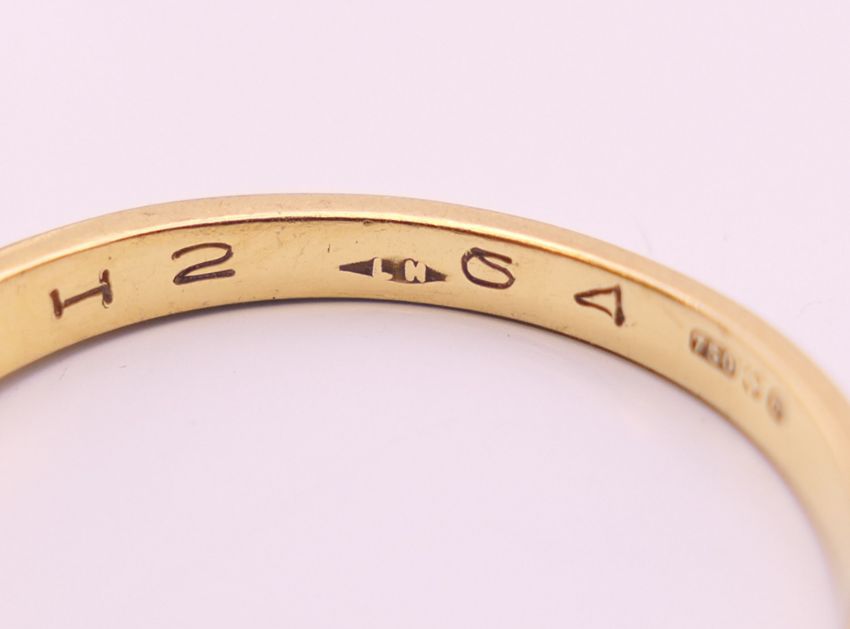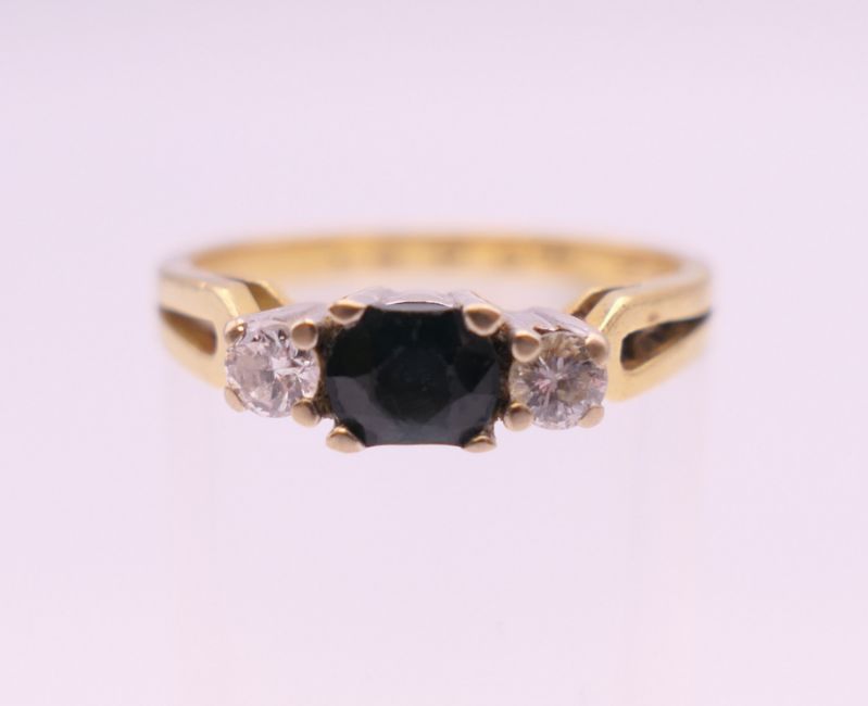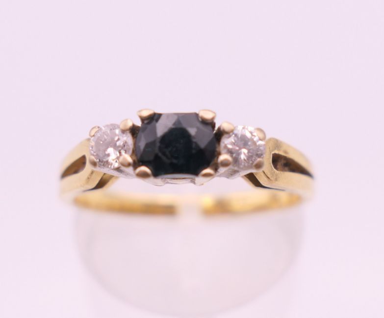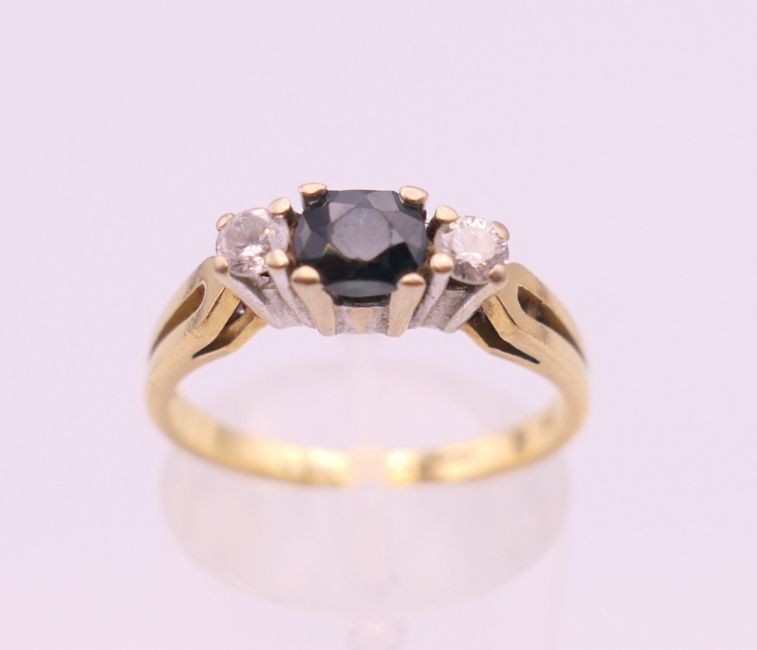 An 18 ct gold diamond and sapphire ring. Ring size N/O. 3.5 grammes total weight.
