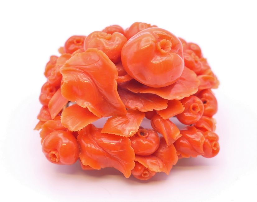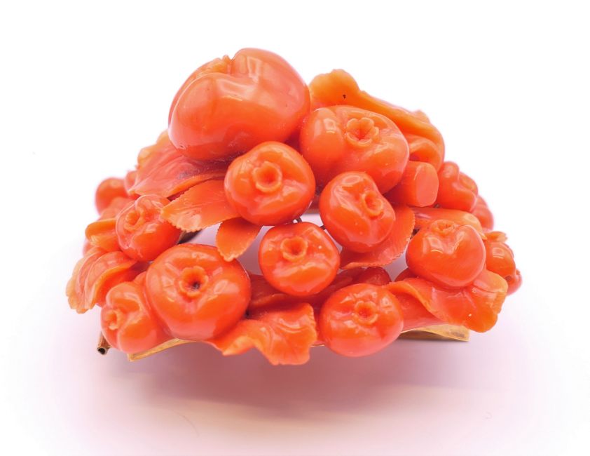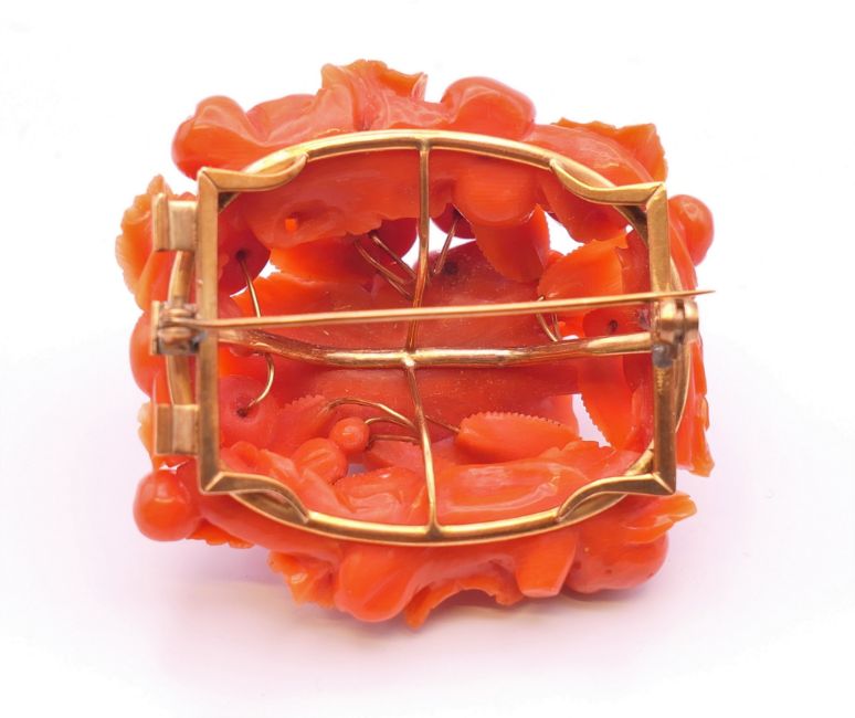 A profusely carved coral brooch. 5.5 x 5.5 cm.
