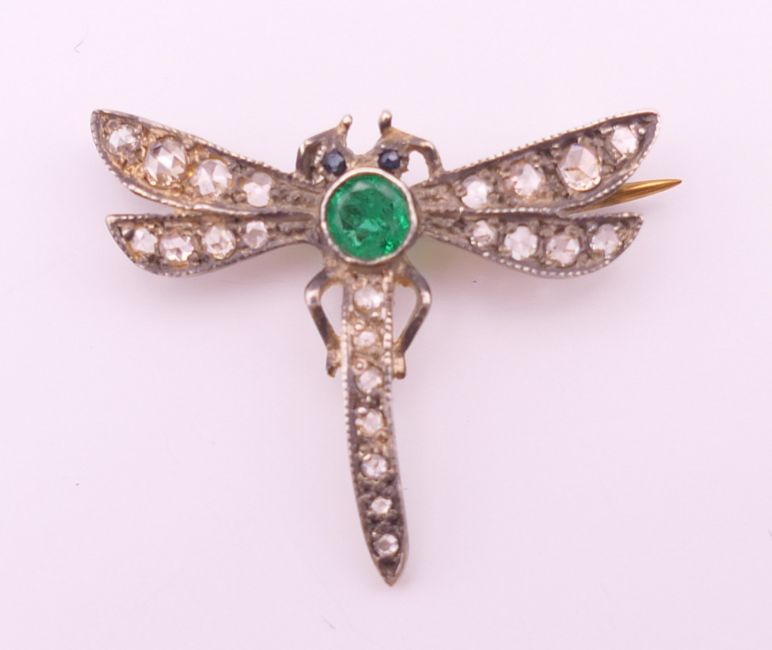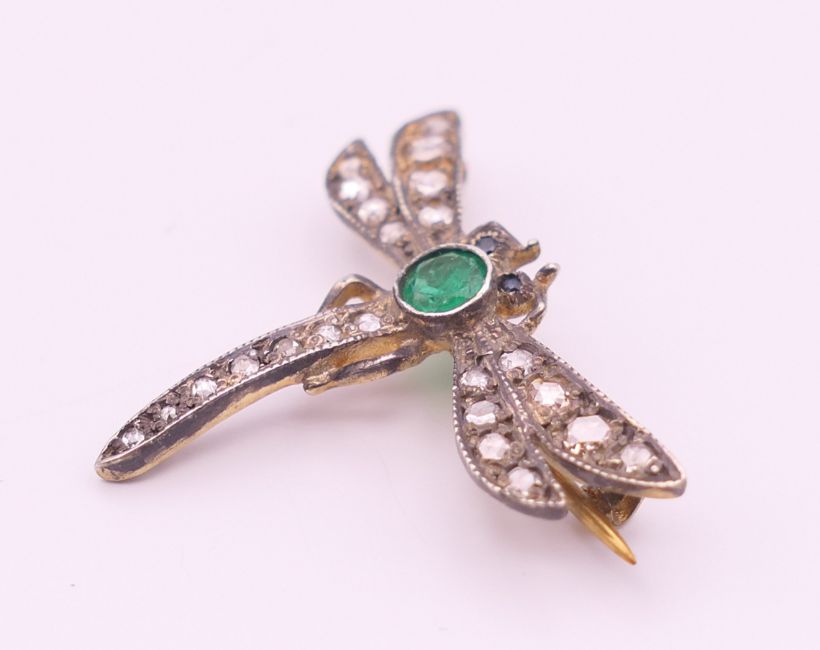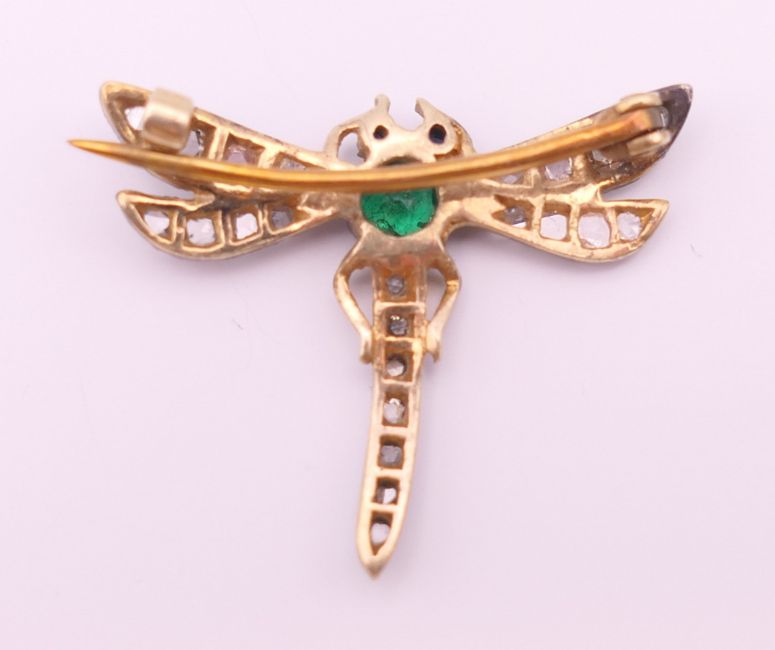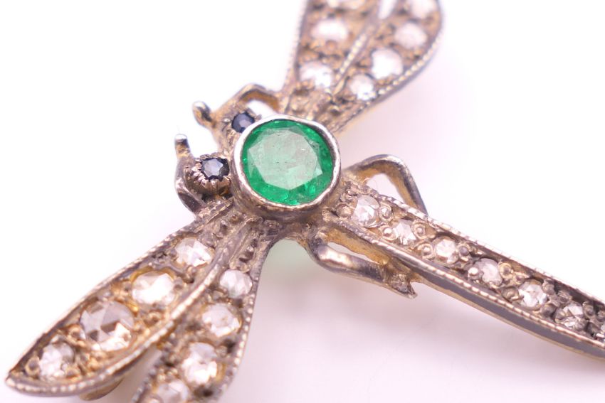 A small unmarked emerald and diamond dragonfly form brooch. 2 cm high, 2.5 cm wide. 1.8 grammes total weight.