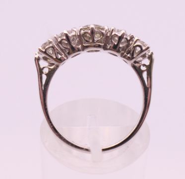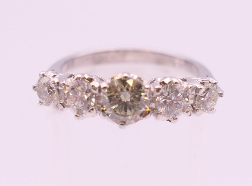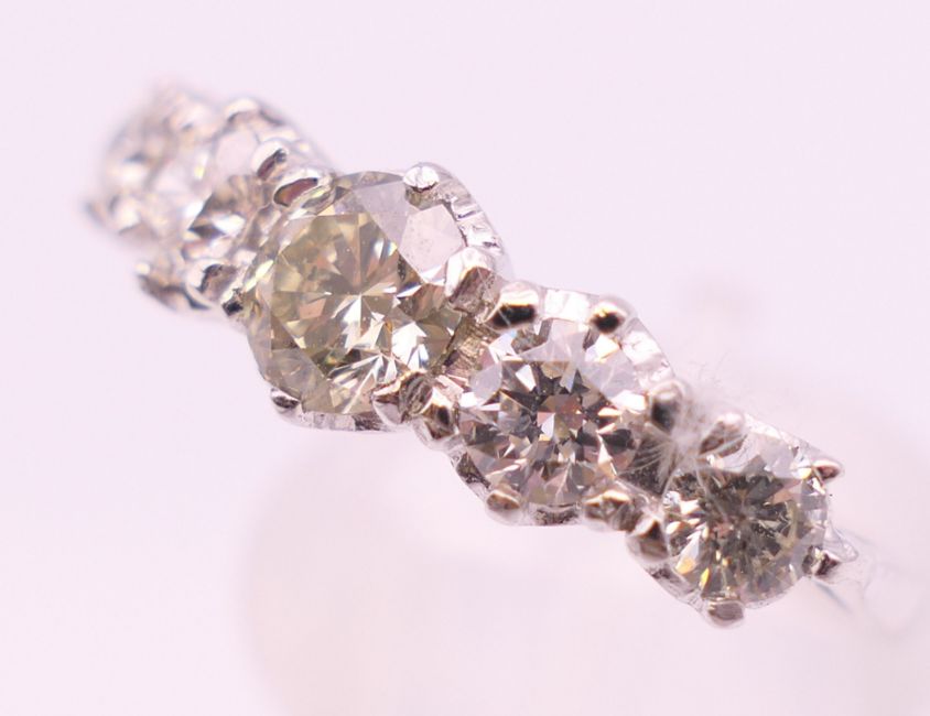 An 18 ct white gold five stone diamond ring. Total diamond weight approximately 1.2 carats. Ring size M.