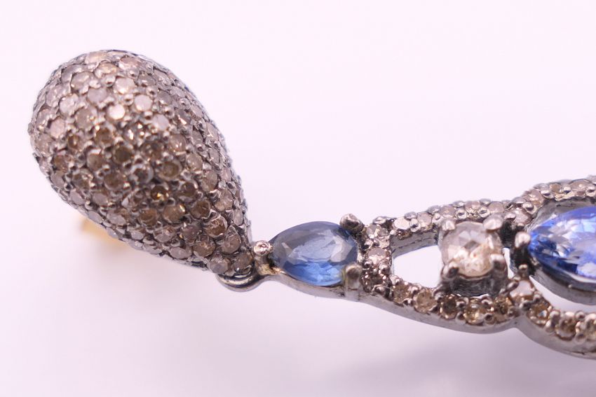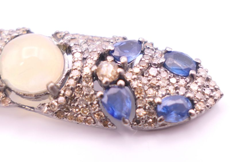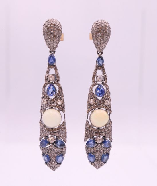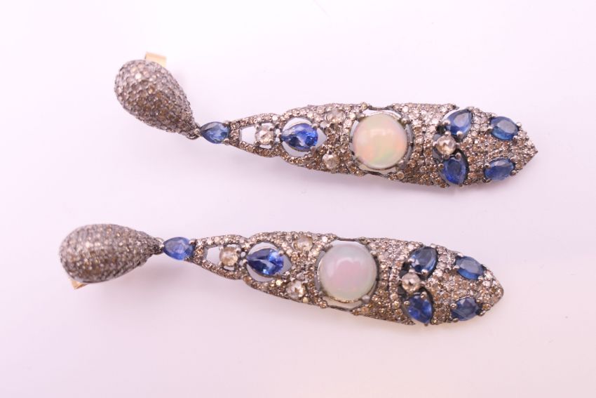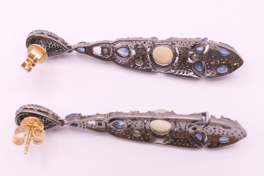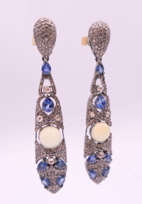 A pair of opal, diamond and sapphire earrings. 5.75 cm high.
