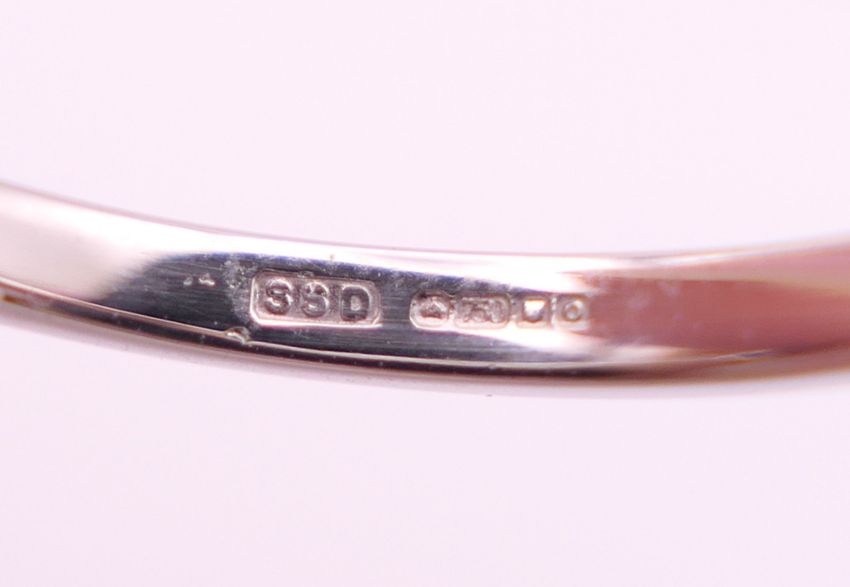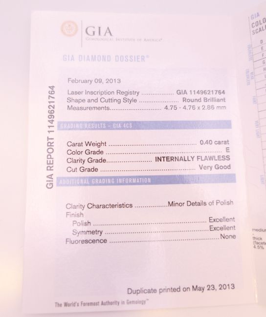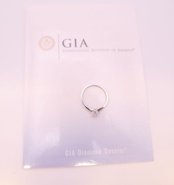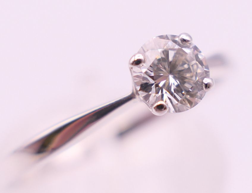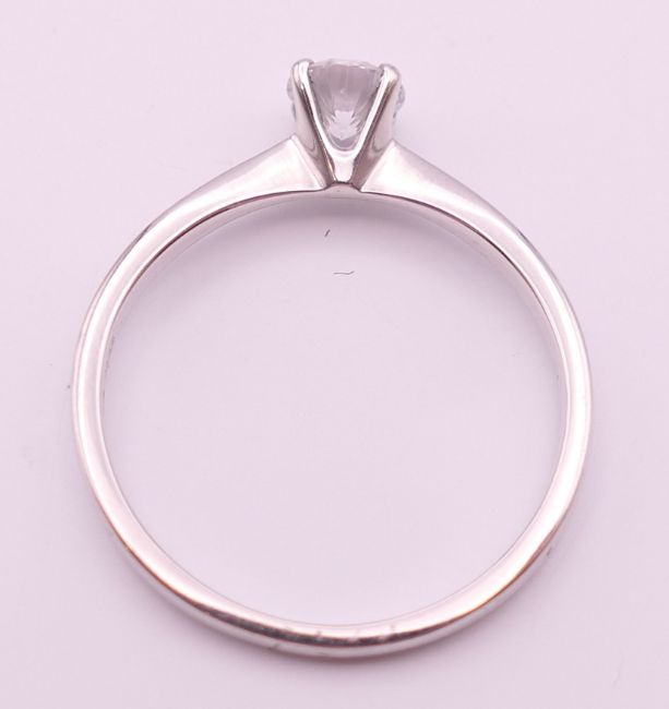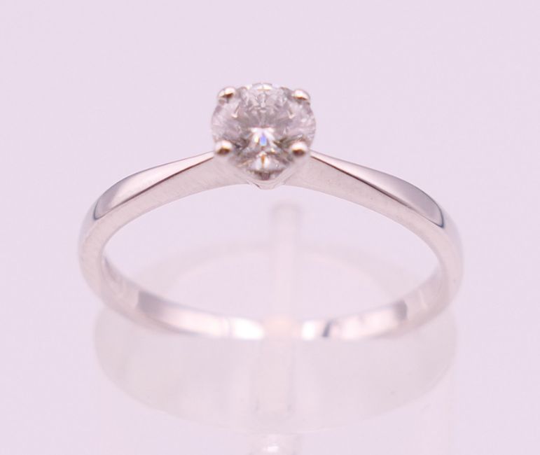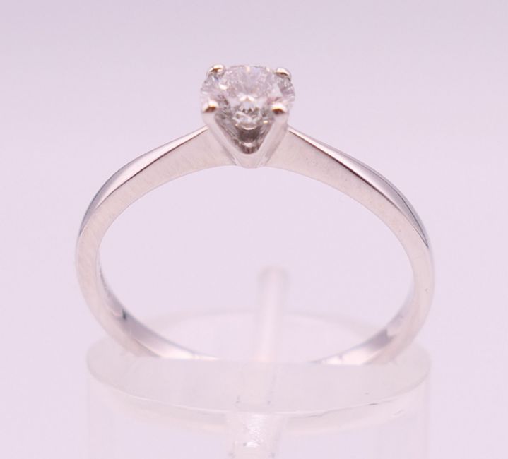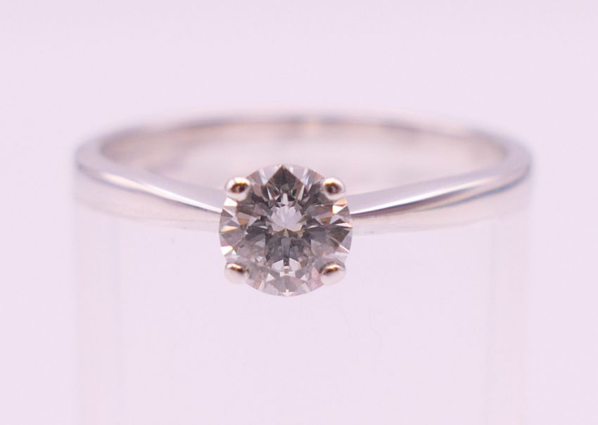 An 18 ct white gold solitaire ring with GIA (Gemological Institute of America) certificate, the diamond weight 0.4 carat diamond. Ring size M/N.