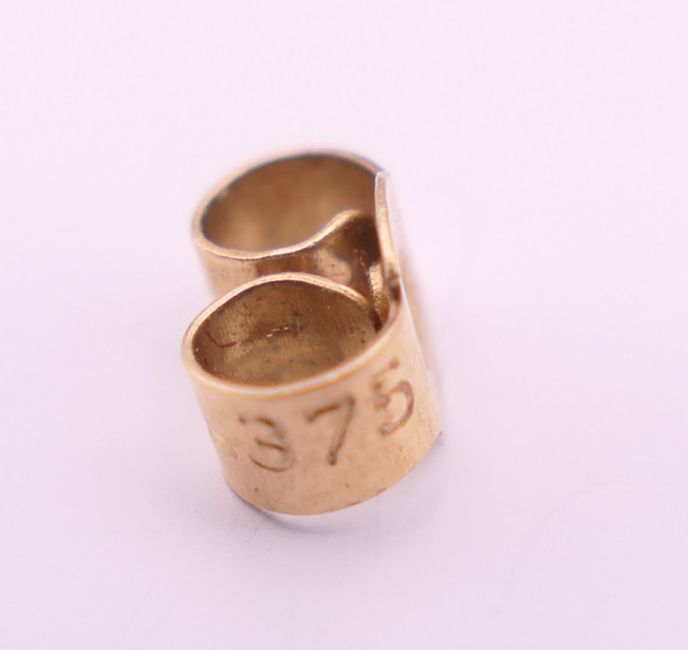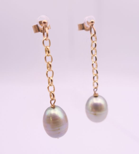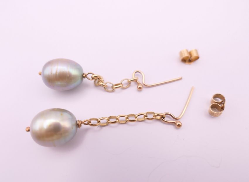 A pair of 9 ct gold and pearl drop earrings. 3.5 cm high overall, pearl 1 cm high.