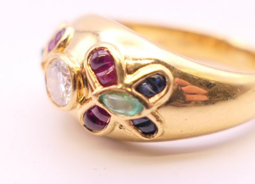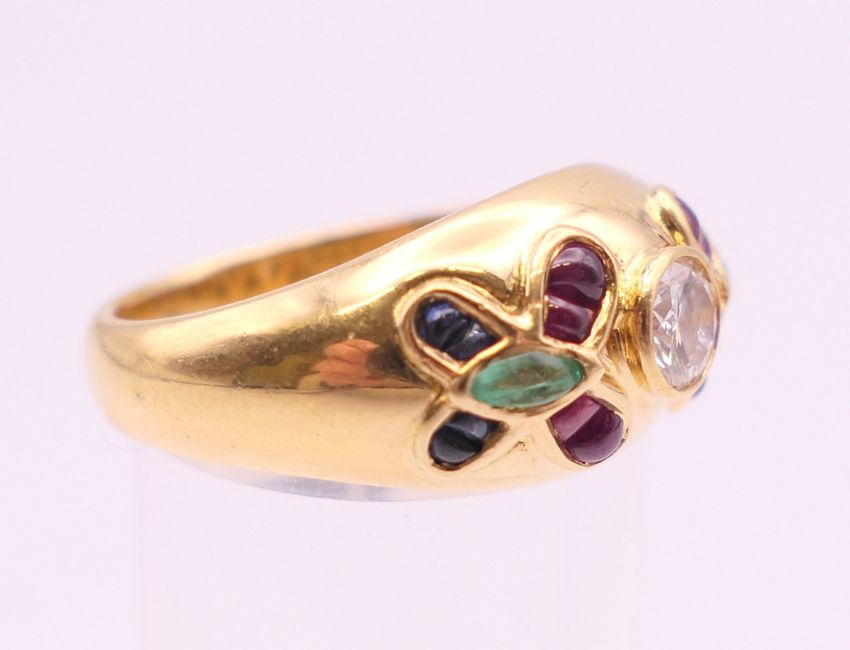 An 18 ct gold diamond, sapphire, ruby and emerald ring. Ring size M.