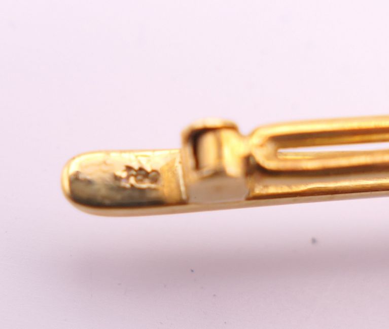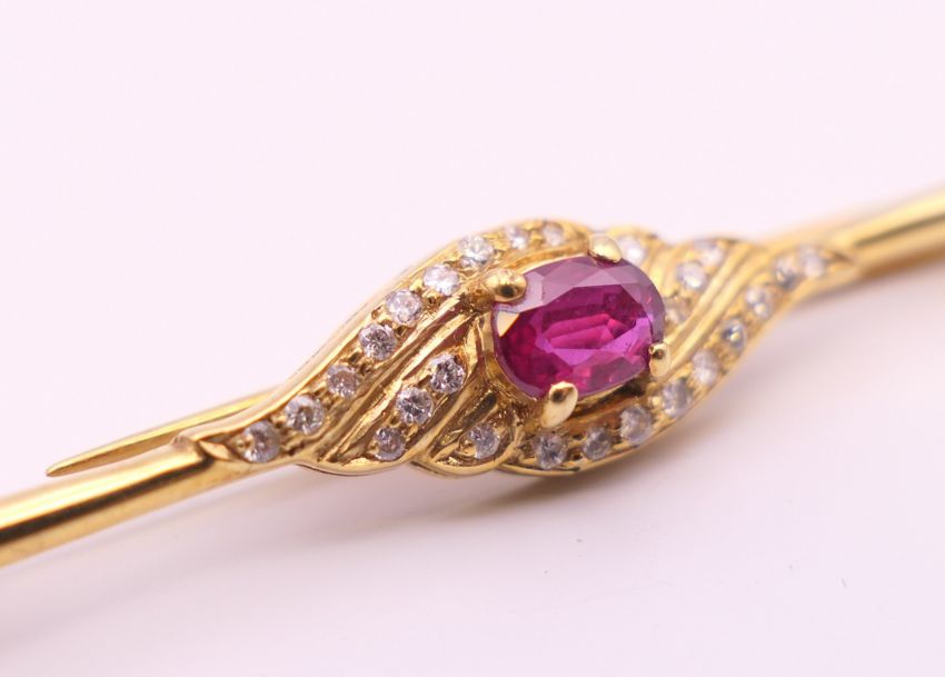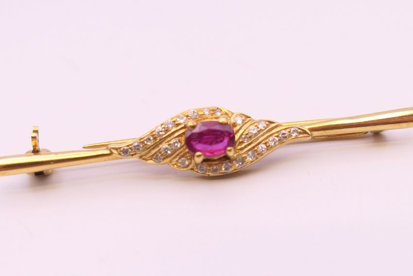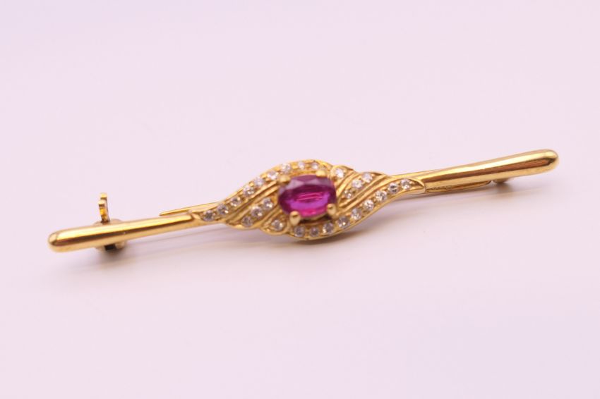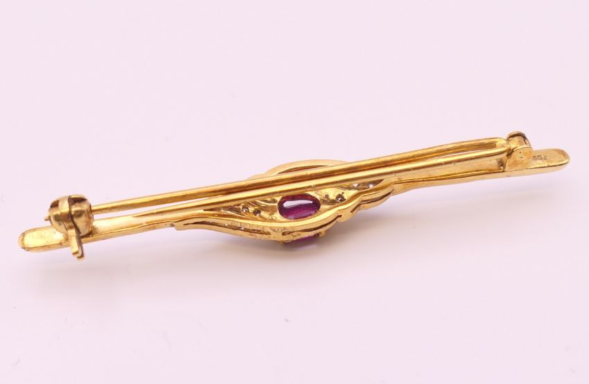 An 18 ct gold ruby and diamond bar brooch. 4.75 cm long. 3.5 grammes total weight.