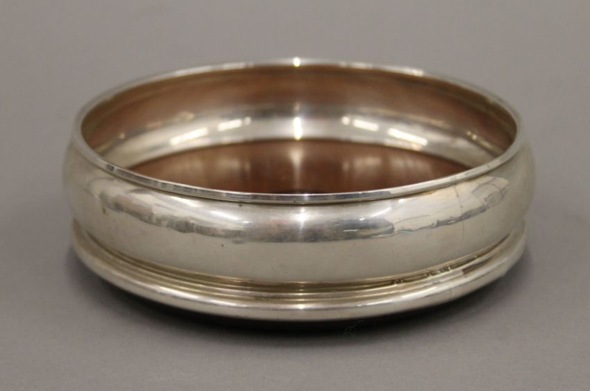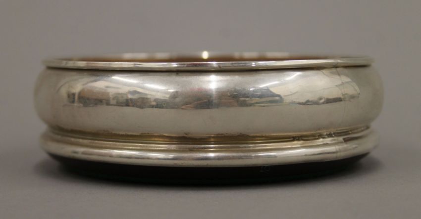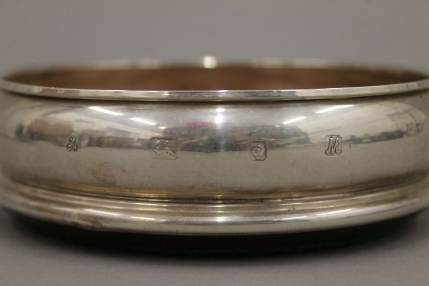 A silver coaster, hallmarked London 1986. 132.5 grammes total weight. 12.5 cm diameter.