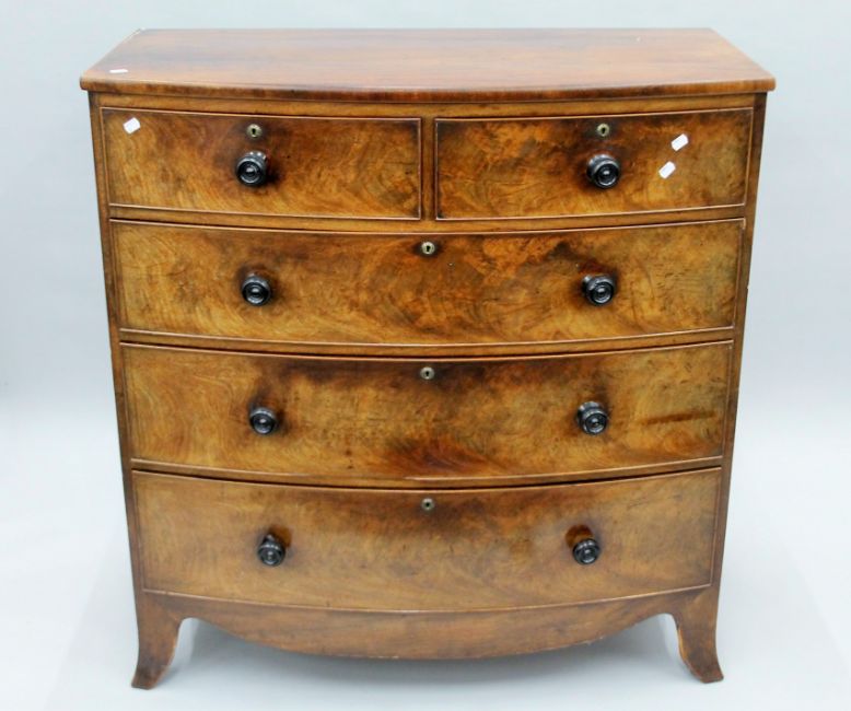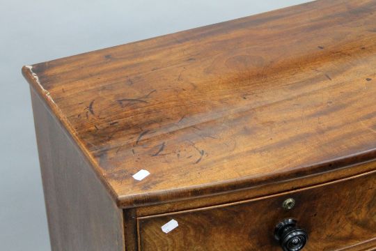 A 19th century mahogany cottage cut bow front chest of drawers. 106 cm wide.