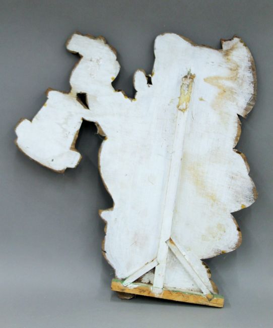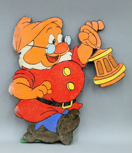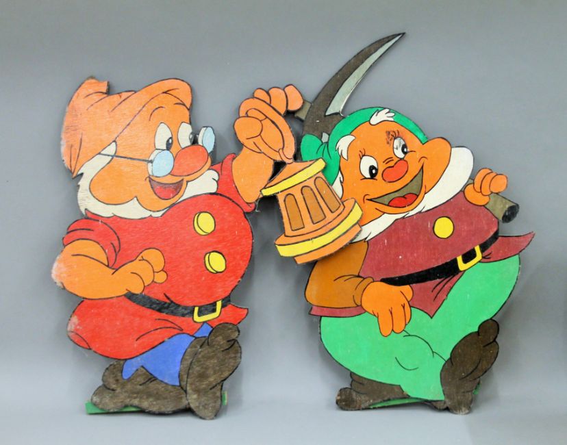Two of Disney's Seven Dwarfs painted wooden cut outs. The largest 64 cm high.