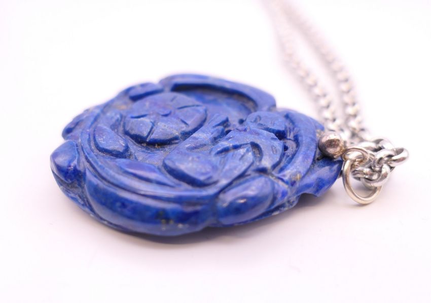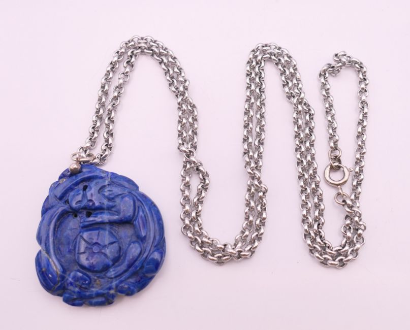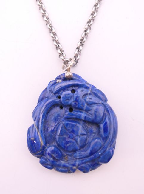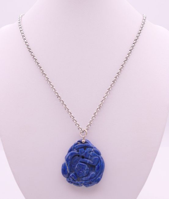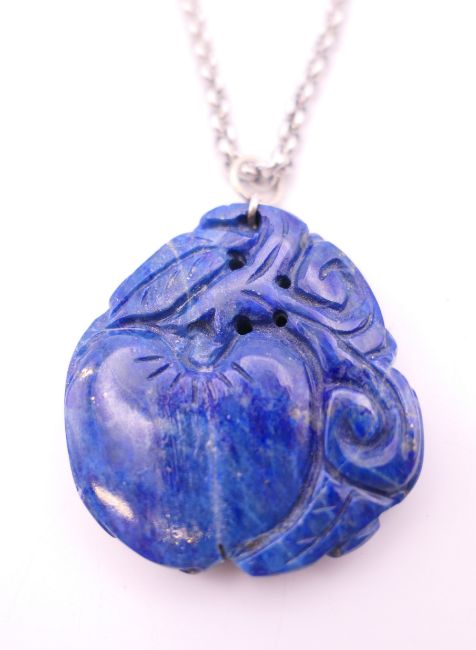 A carved lapis dragon pendant on chain. Pendant 4 cm high, chain 66 cm long.