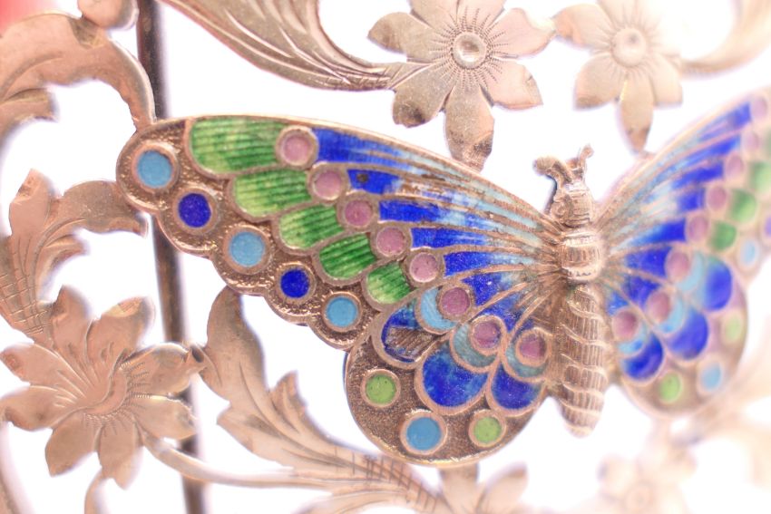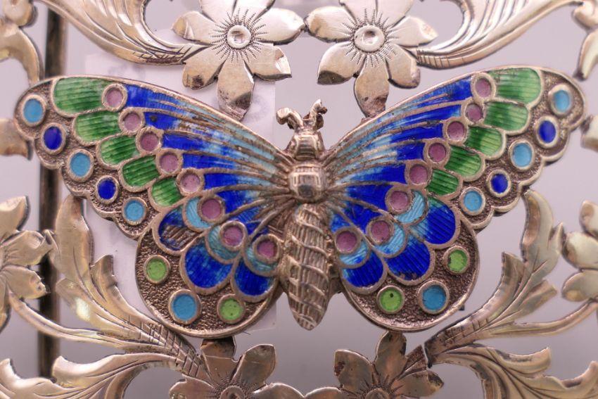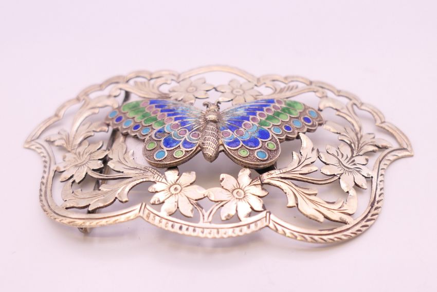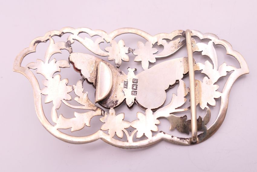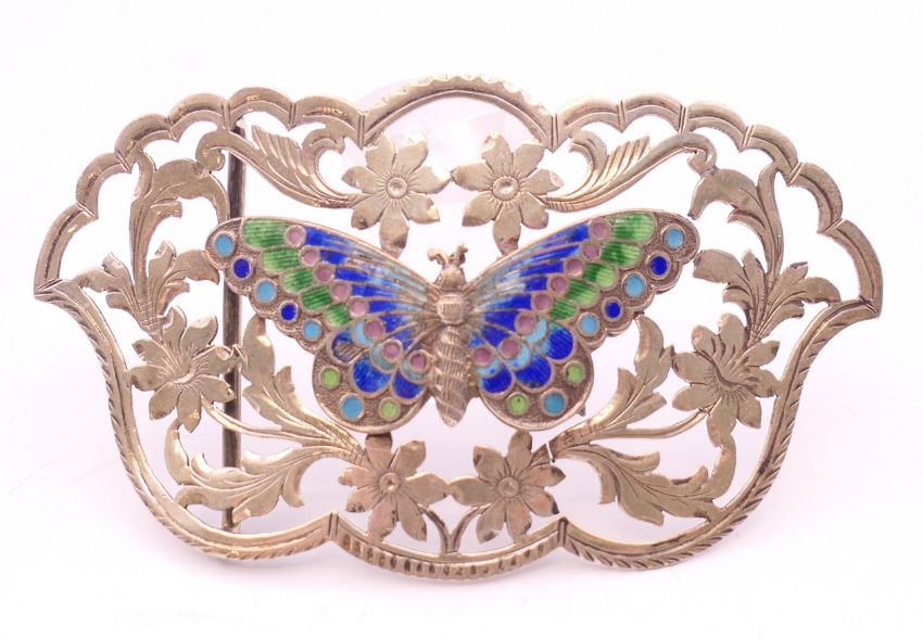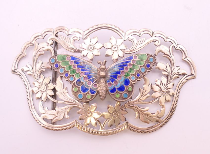 An Art Nouveau silver and enamel belt buckle with butterfly motif. 9 x 5 cm.