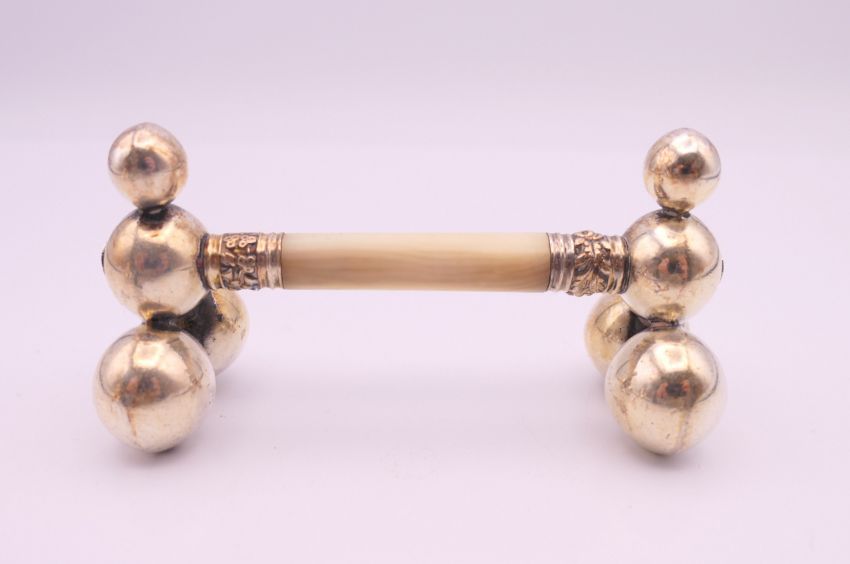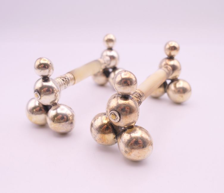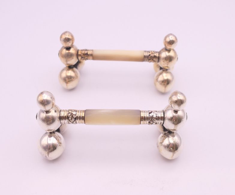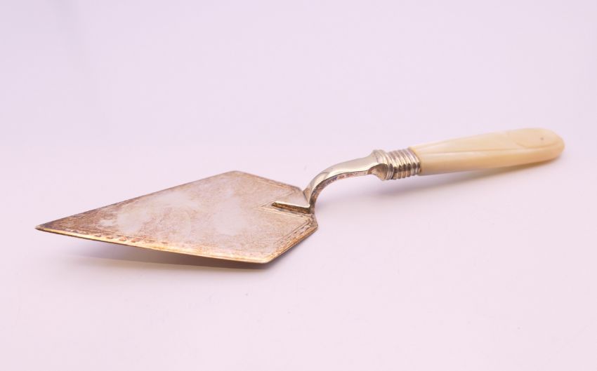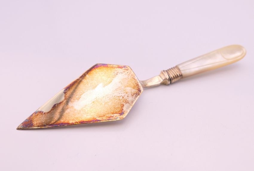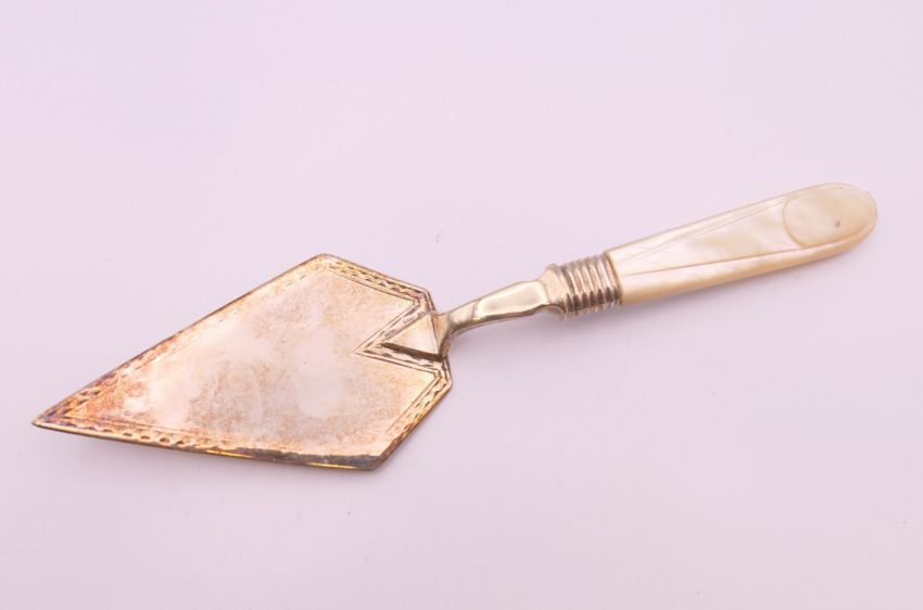 A pair of EPNS and mother-of-pearl knife rests, and an EPNS and mother-of pearl trowel. The latter 15.5 cm long.