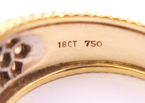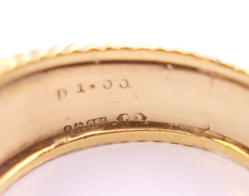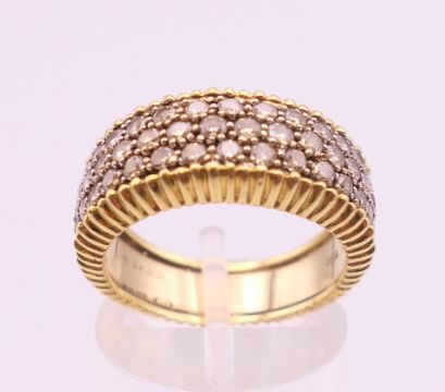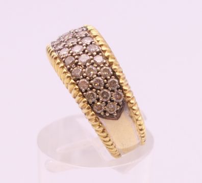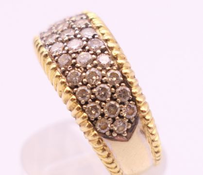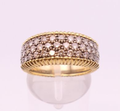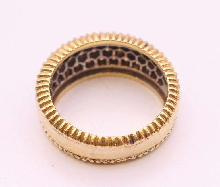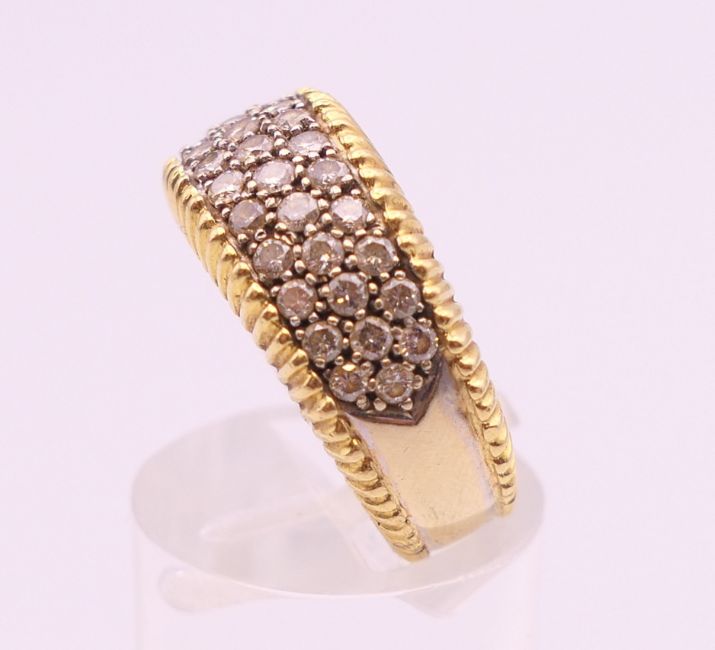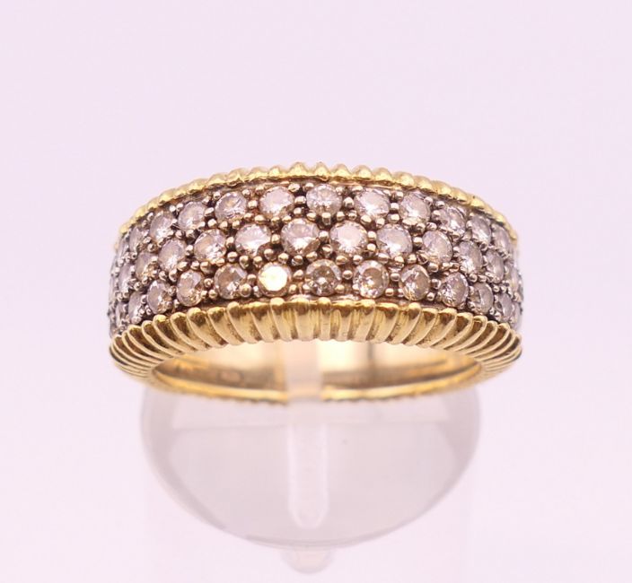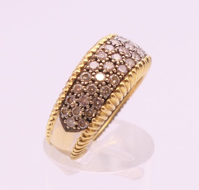 An 18 ct yellow and white gold diamond set ring. Approximately 1 carat total diamond weight. Ring size N/O. 9.3 grammes total weight.