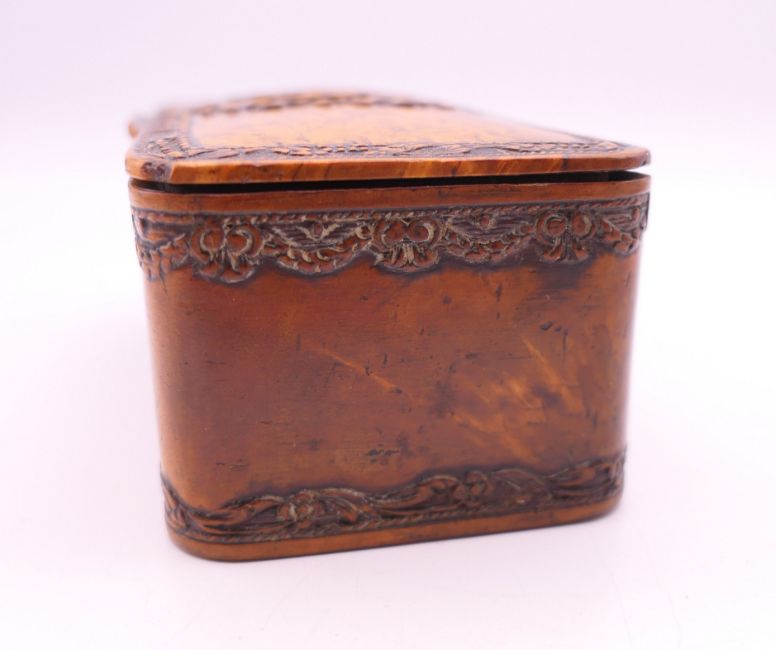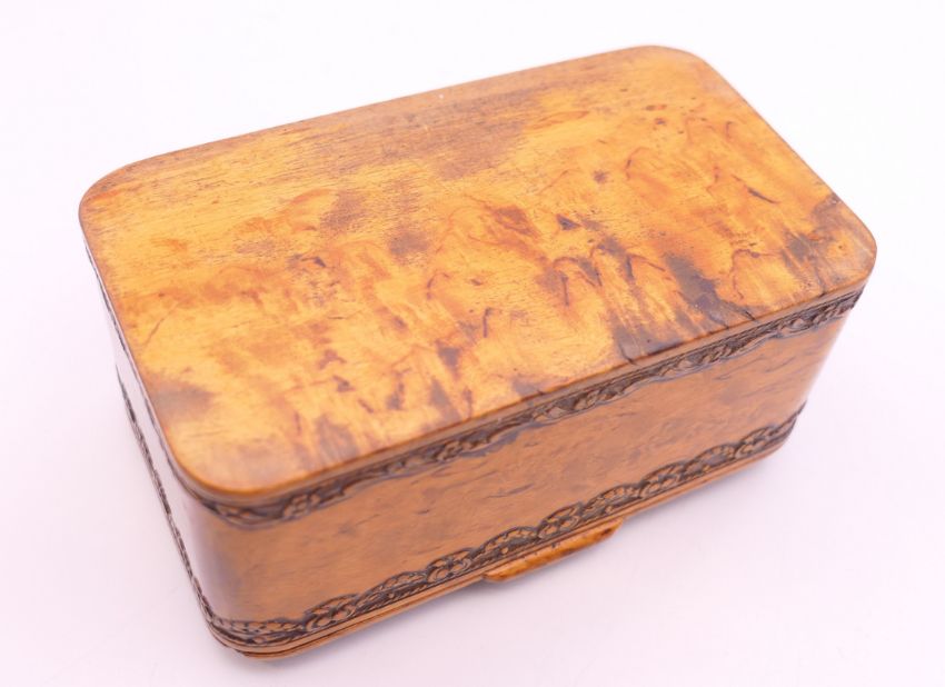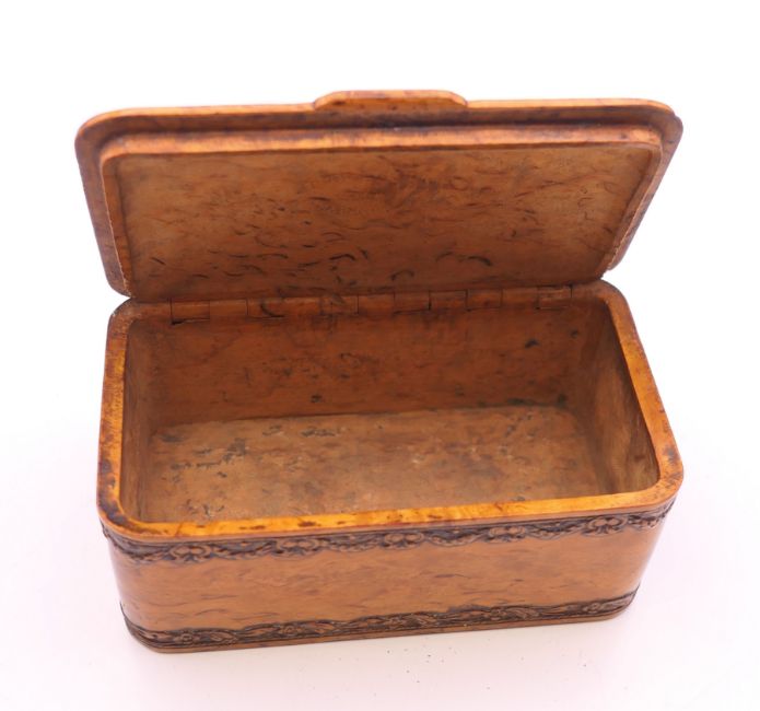 A finely carved early 19th century burr wood table snuff box, fine decoration of flowers and swag border, impressed under lid F Pontet June, 60, Charing Cross. 9.5 cm long x 5.5 cm deep x 4.25 cm high.