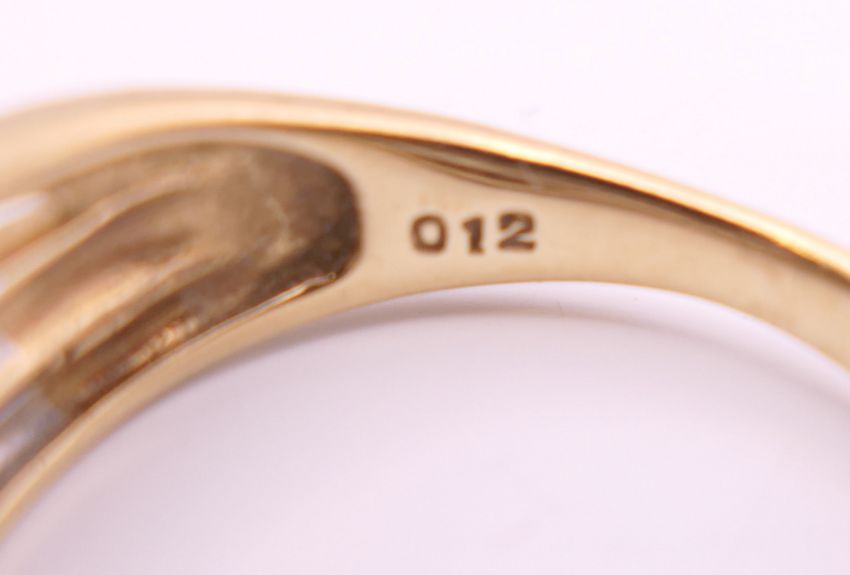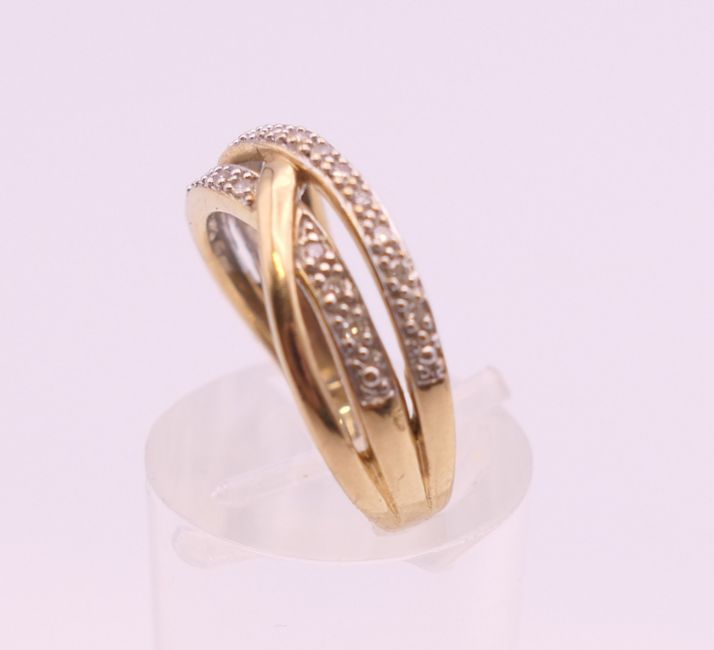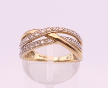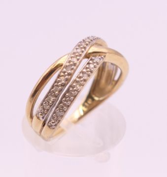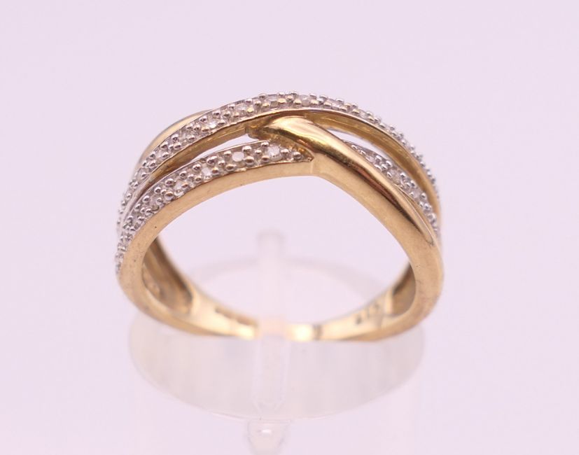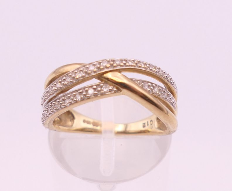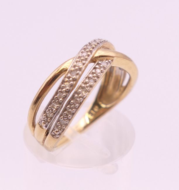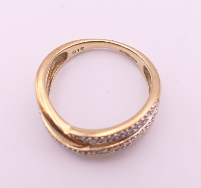 A 9 ct gold diamond ring. Ring size M. 3.2 grammes total weight.