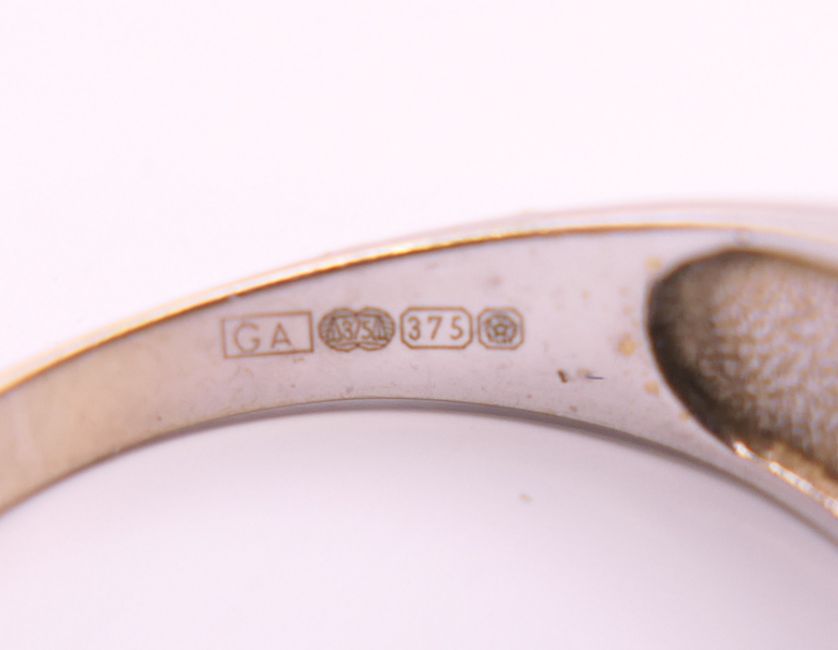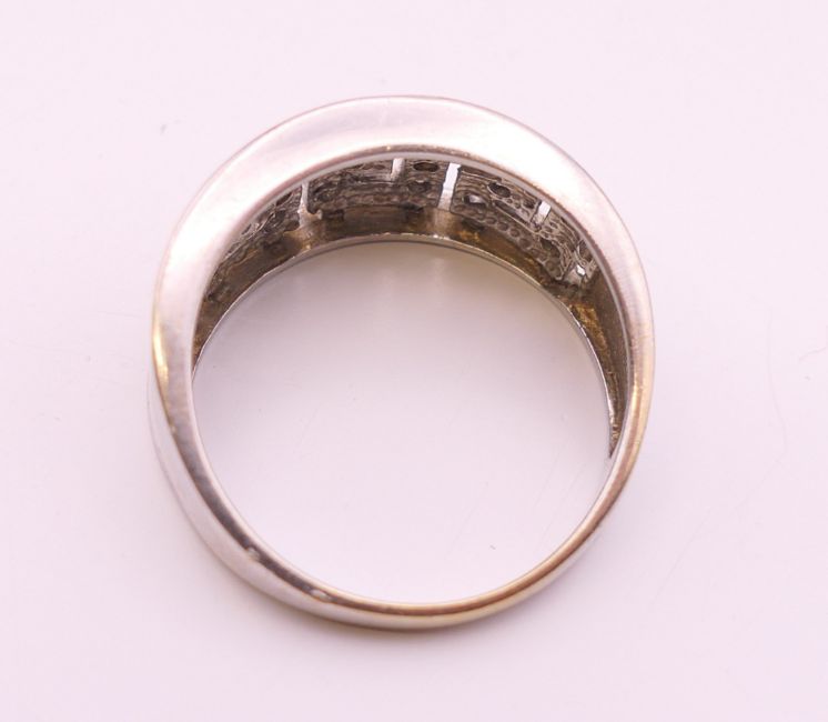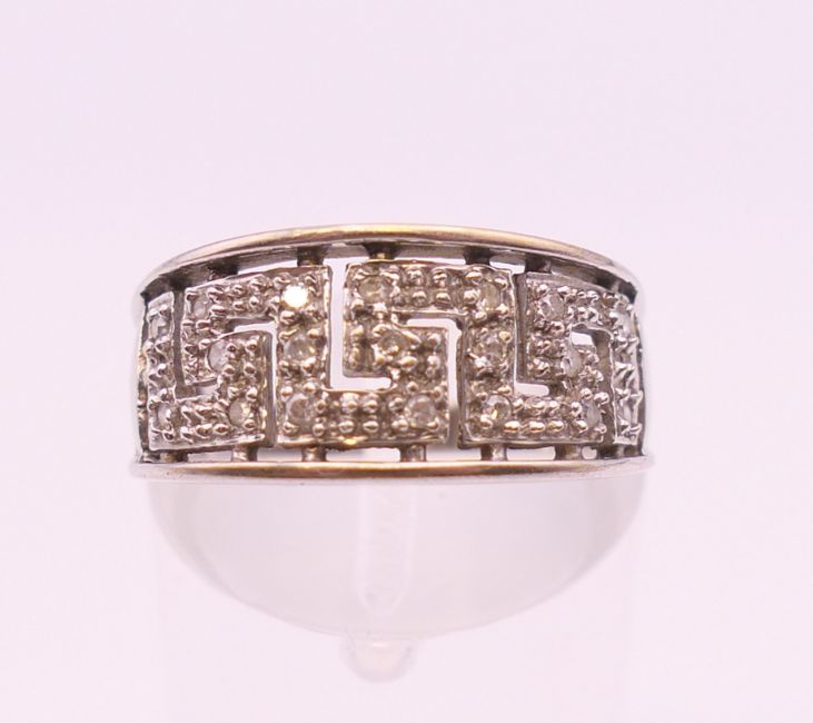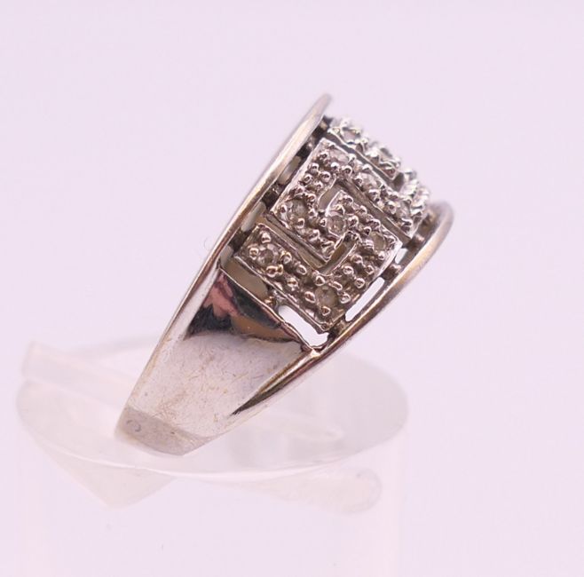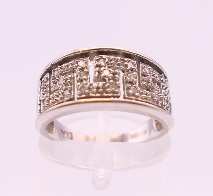 A 9 ct white gold Greek key design diamond set ring. Ring size L. 2.8 grammes total weight.