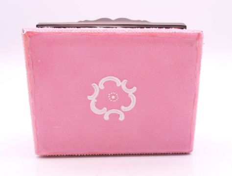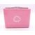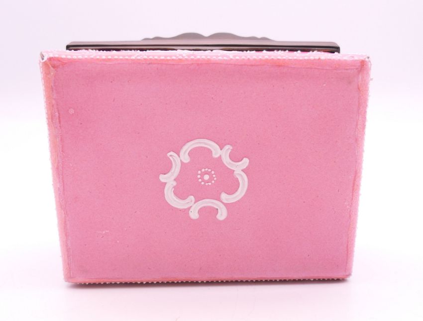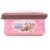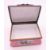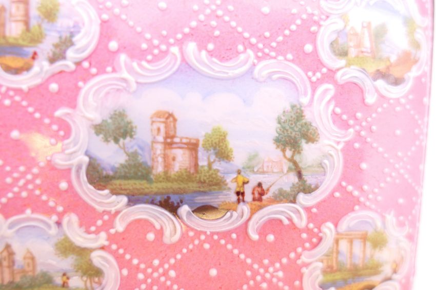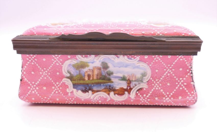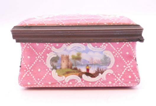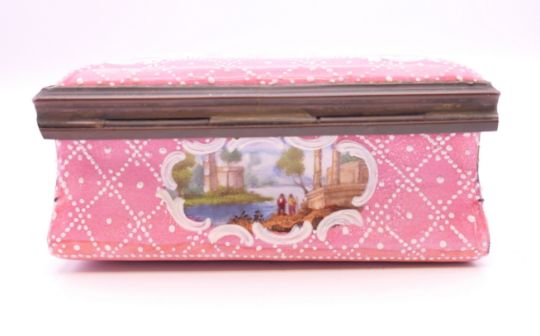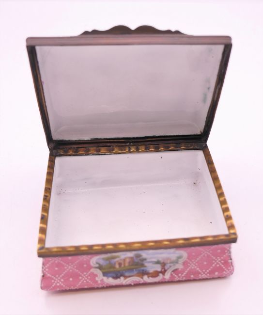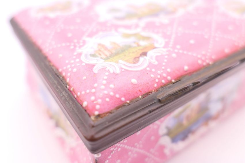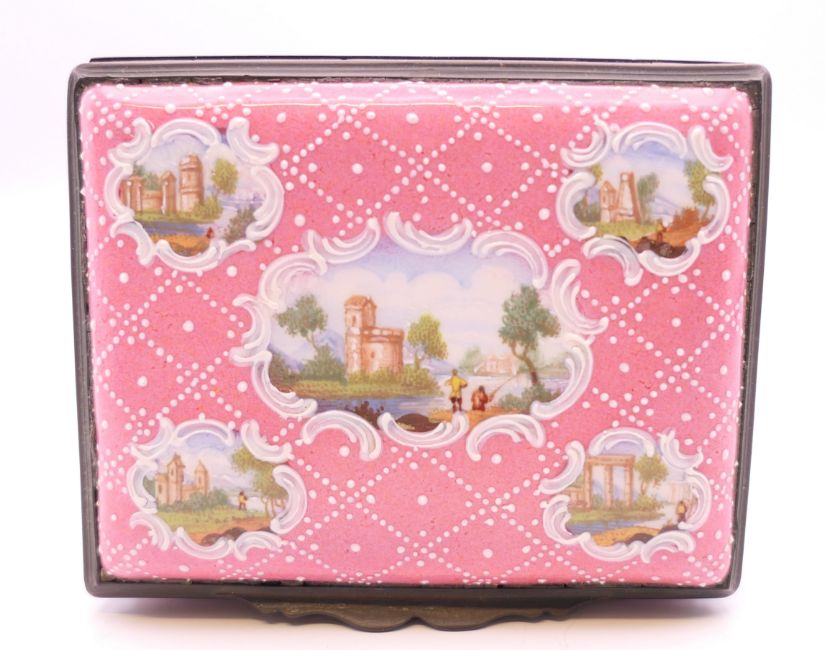 An 18th century pink ground Battersea enamel snuff box of rectangular form, finely painted with landscapes in cartouches. 8.5 cm x 6.5 cm.