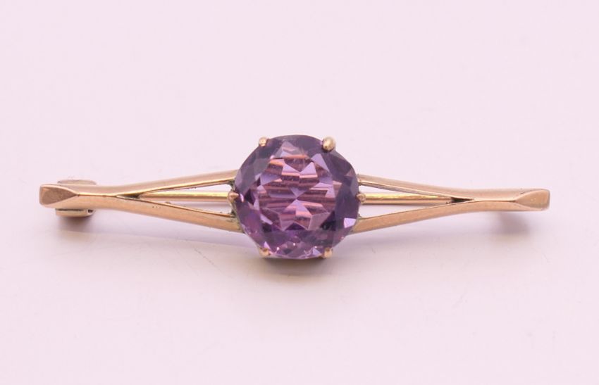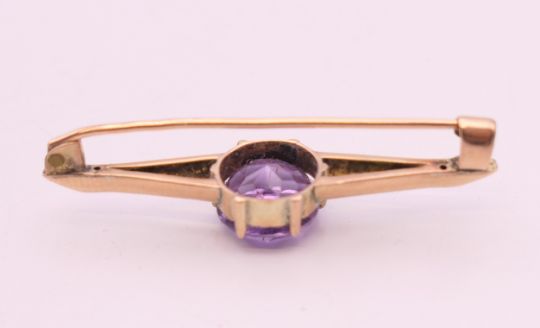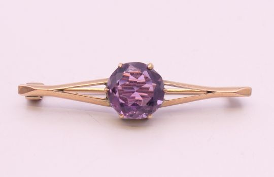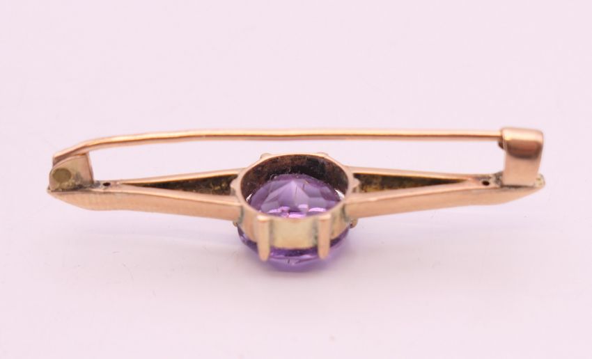 An unmarked 9 ct gold and amethyst bar brooch. 4 cm wide. 2.9 grammes total weight.