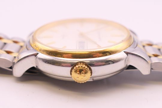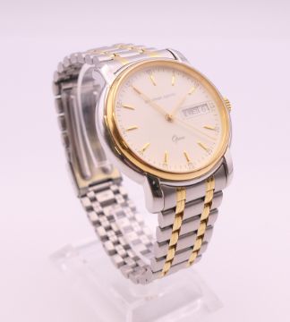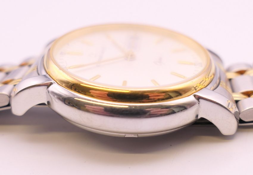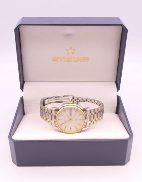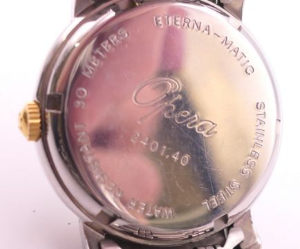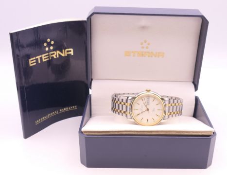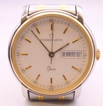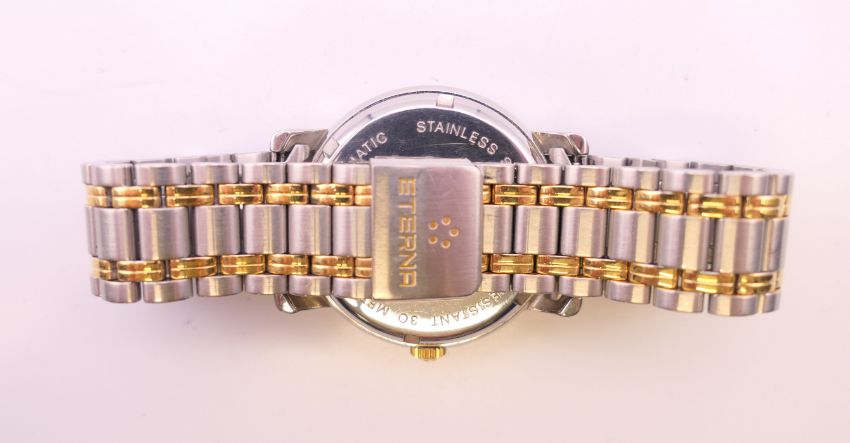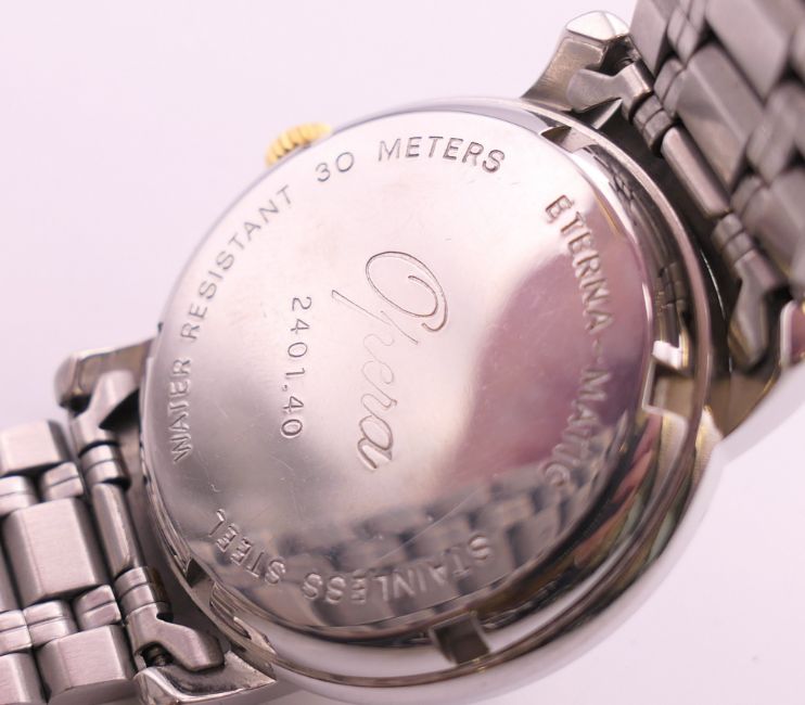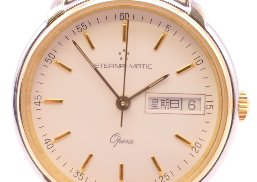 An Eterna-Matic gold plated stainless steel Opera automatic bracelet watch, ref 2401.40, white dial with gilt baton hour markers, sweep centre seconds hand and day/date aperture, boxed with papers. 3.5 cm wide.