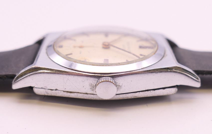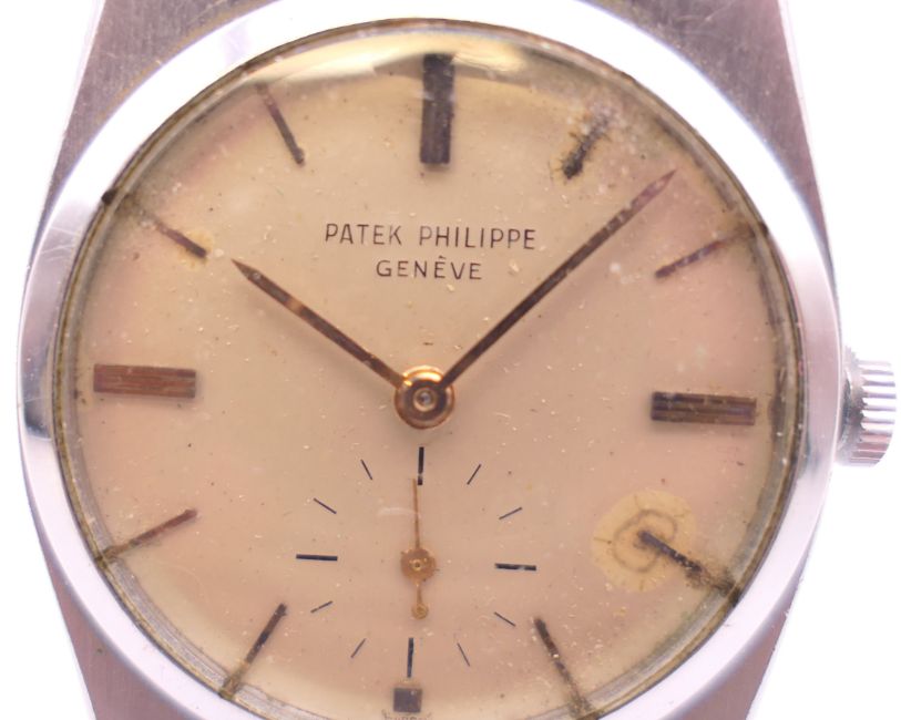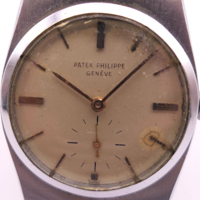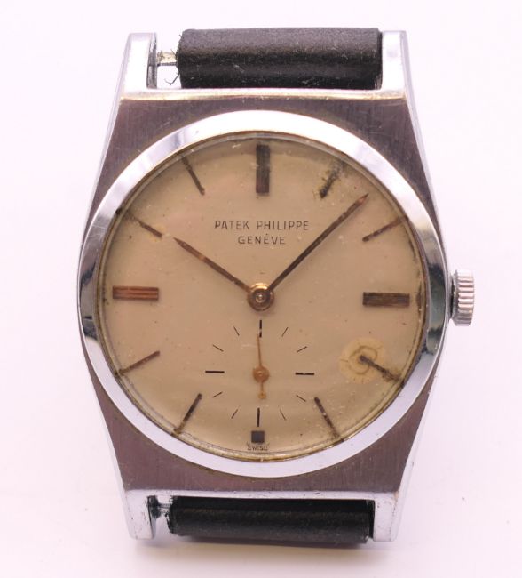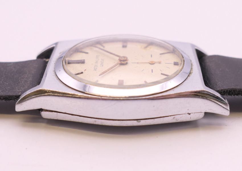 A Patek Philippe chromium plated automatic wristwatch with silvered dial with gilt baton hour markers, subsidiary seconds dial and brushed tonneau shaped case, 30 jewel movement with calibre 12-600 AT, serial no 762941. 3.25 cm wide.