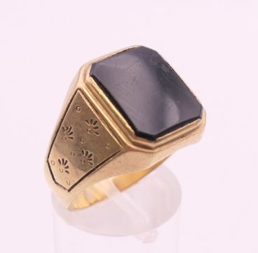 A 9 ct gold gentleman's onyx set ring. Ring size V. 7.4 grammes total weight.