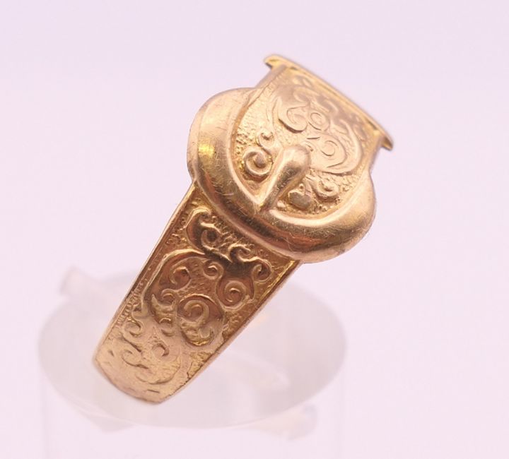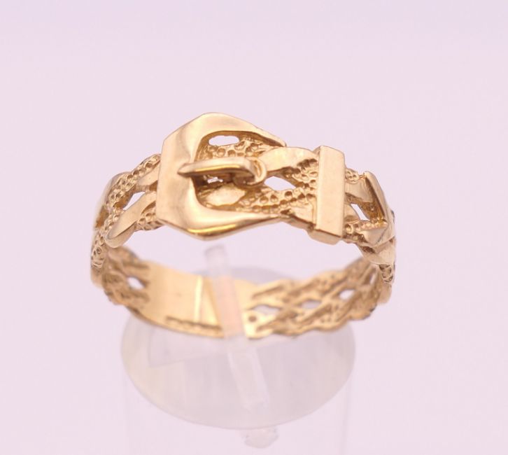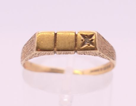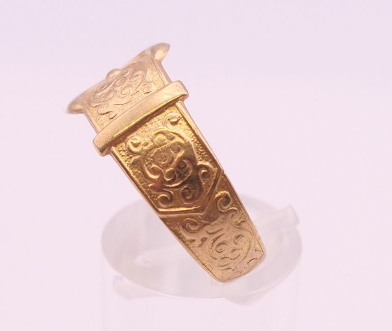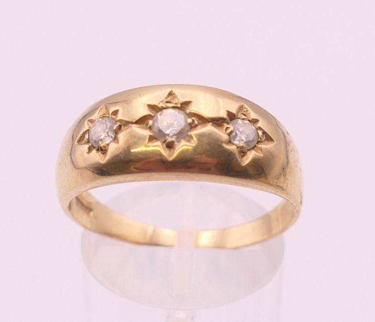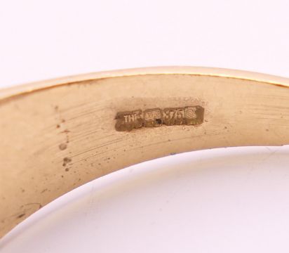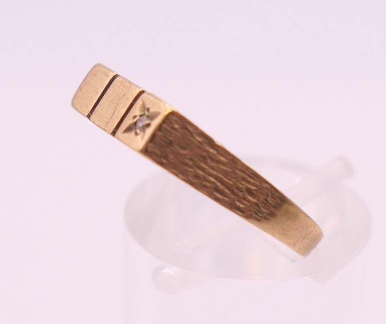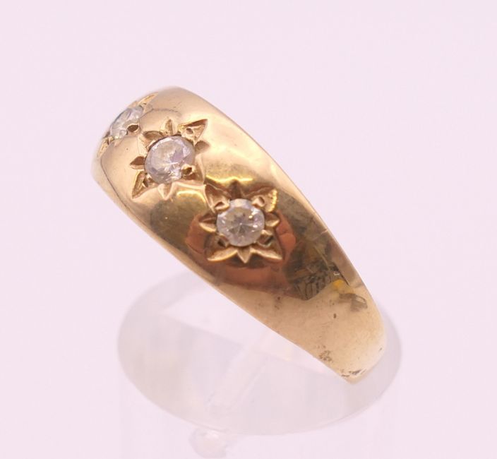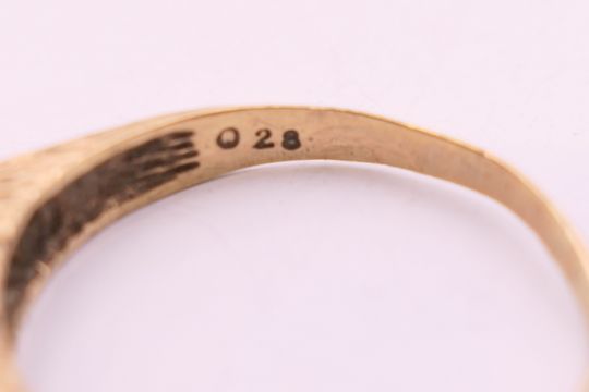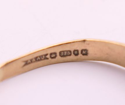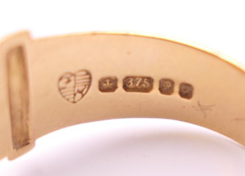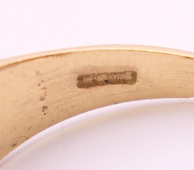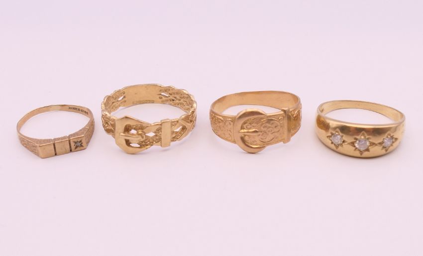 Four 9 ct gold rings. 13.4 grammes total weight.