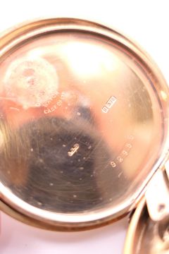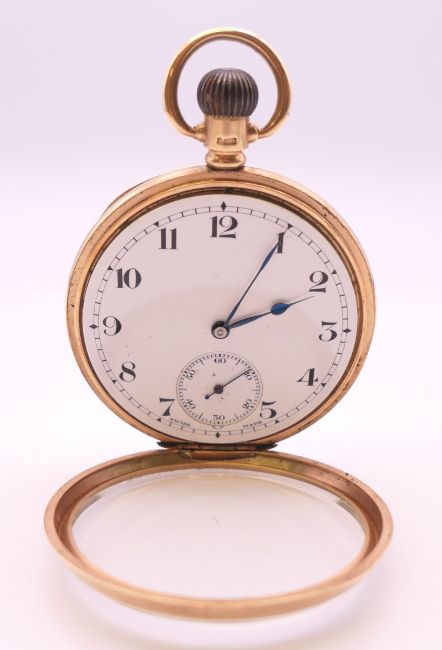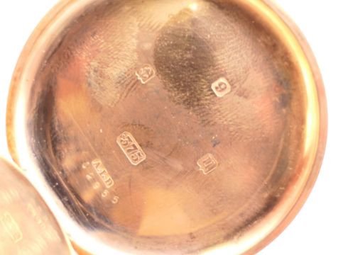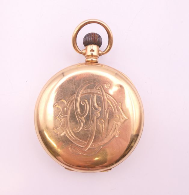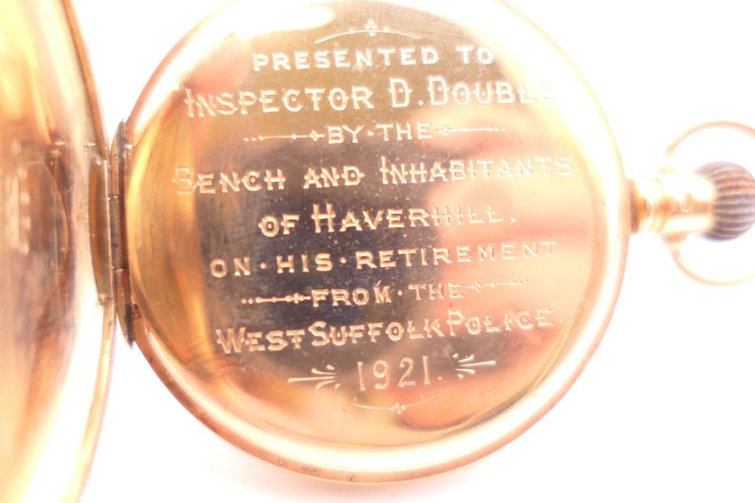 A 9 ct gold pocket watch, engraved to the interior ' Presented to Inspector D Double by the bench and inhabitants of Haverhill on his retirement from West Suffolk Police 1921'. The reverse of case engraved with initials. 5 cm diameter. 84.6 grammes total weight.