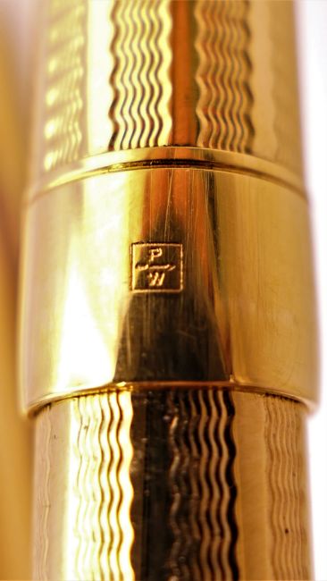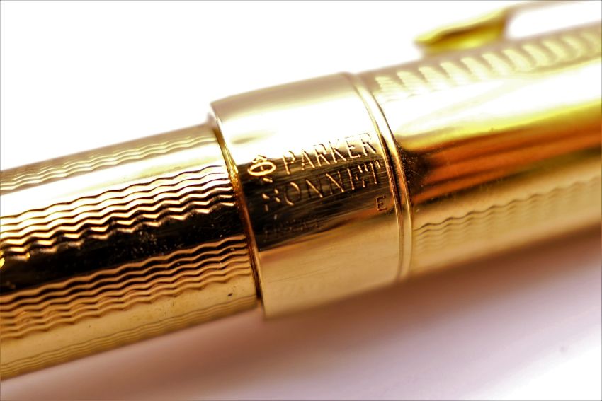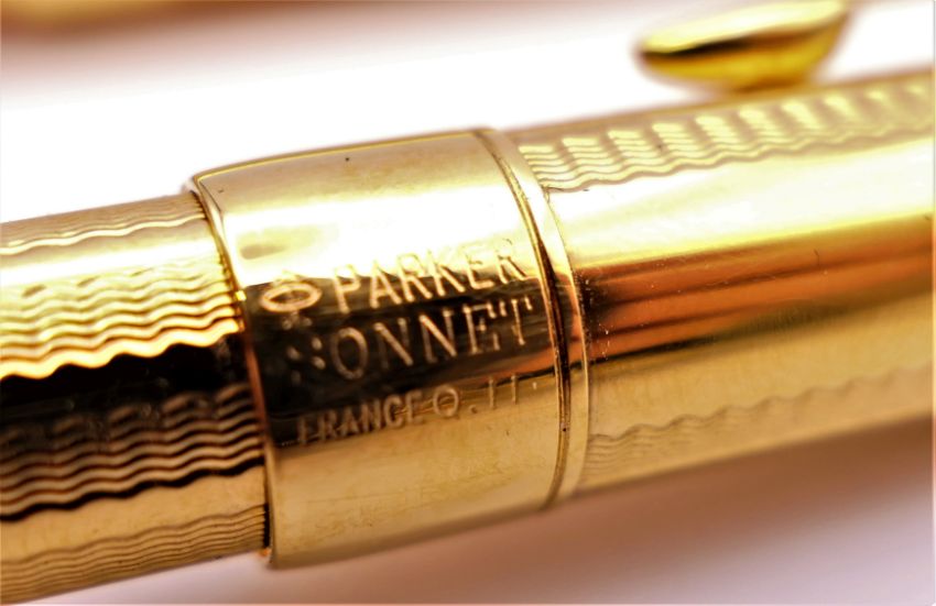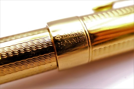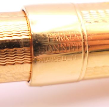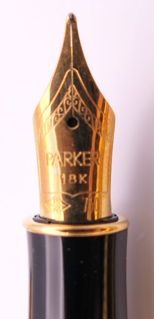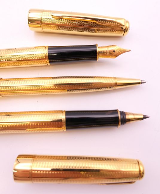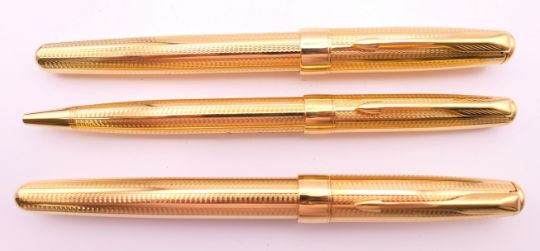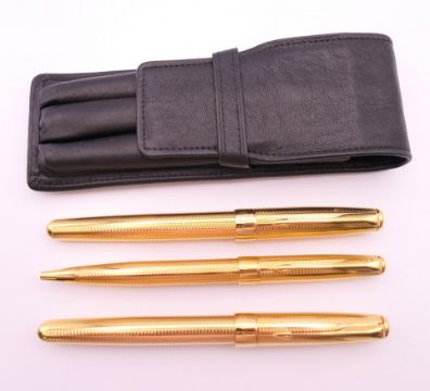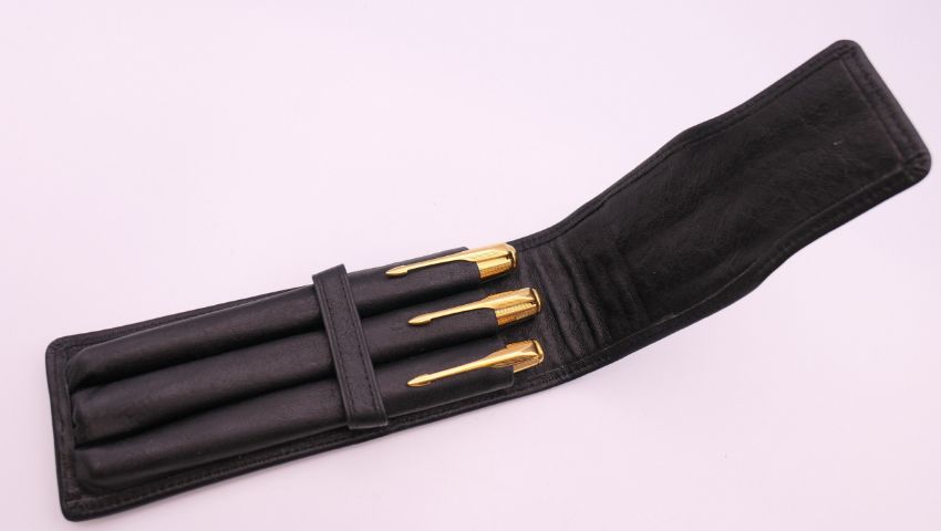 Three Parker pens in a leather case including a fountain pen with 18K gold nib.