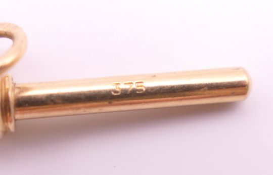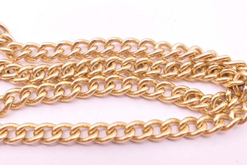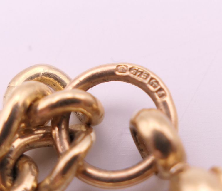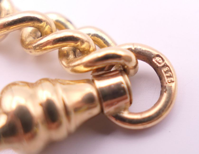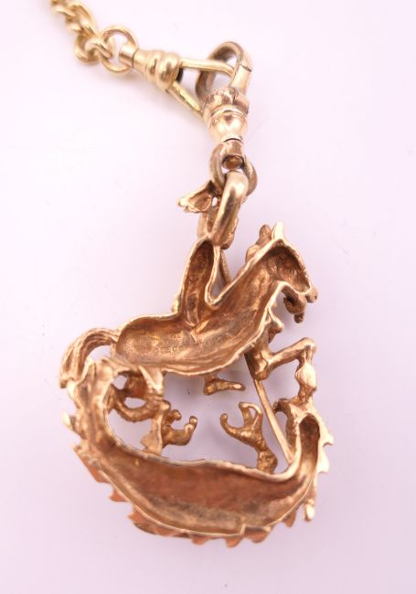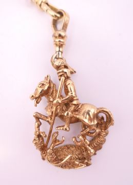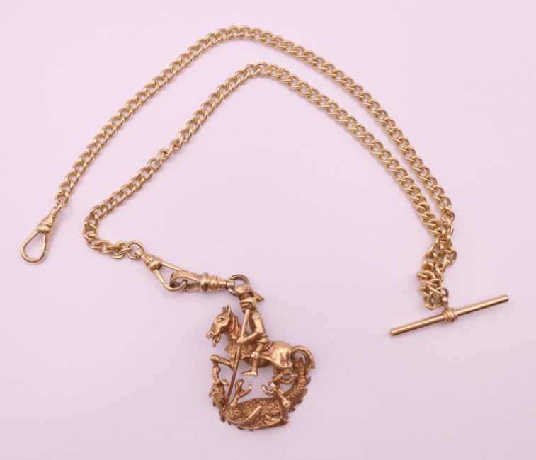 A 9 ct gold watch chain and 9 ct gold fob pendant of Saint George slaying the dragon. Chain 46 cm long, fob 4.5 cm high excluding suspension loop. 42.3 grammes.