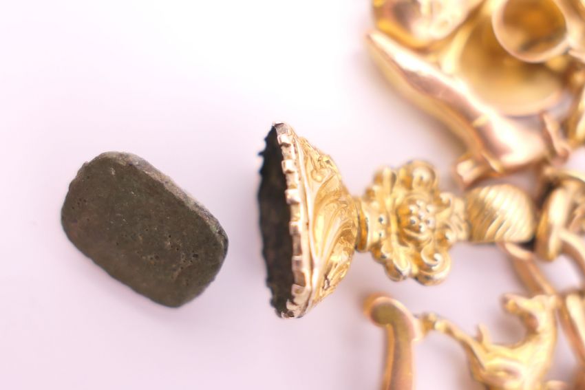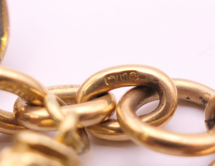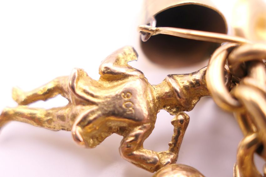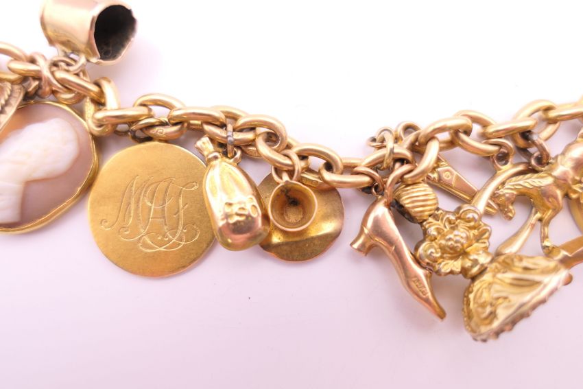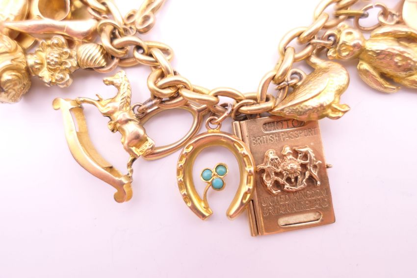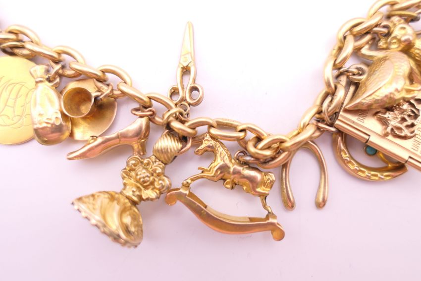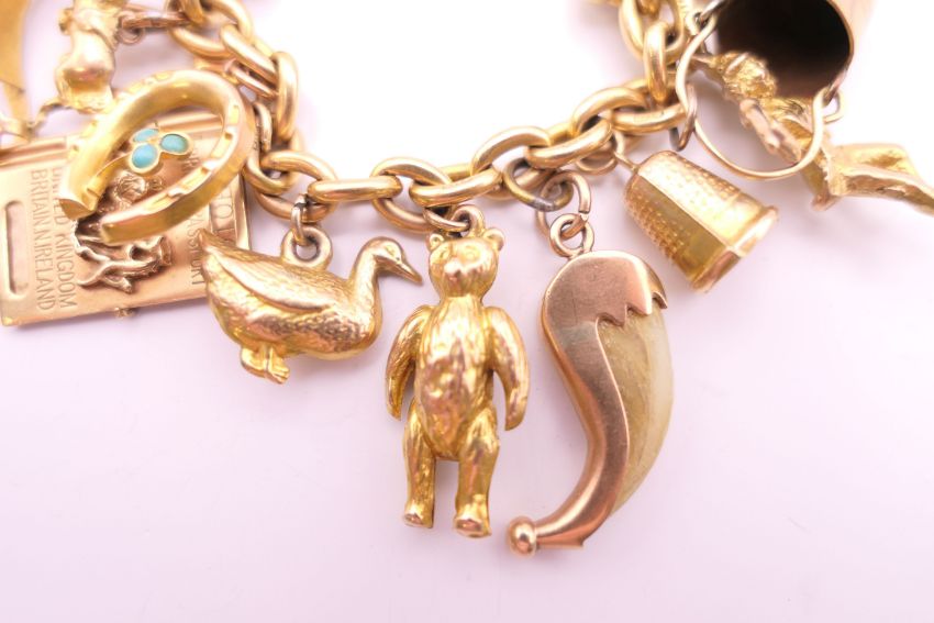 A 9 ct gold charm bracelet. 20 cm long. 61.9 grammes total weight.