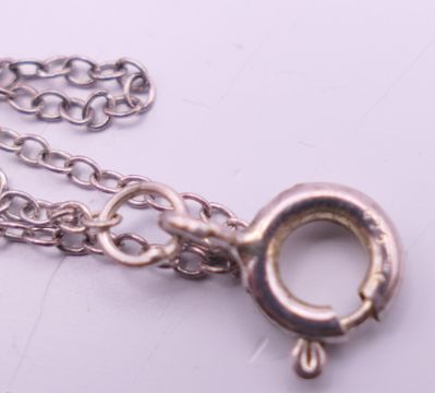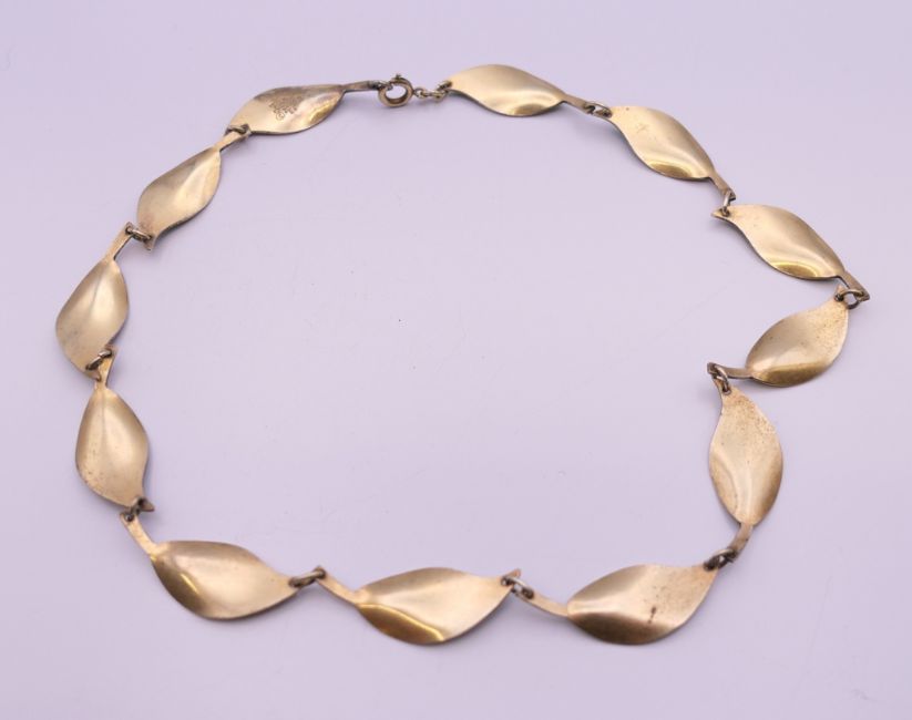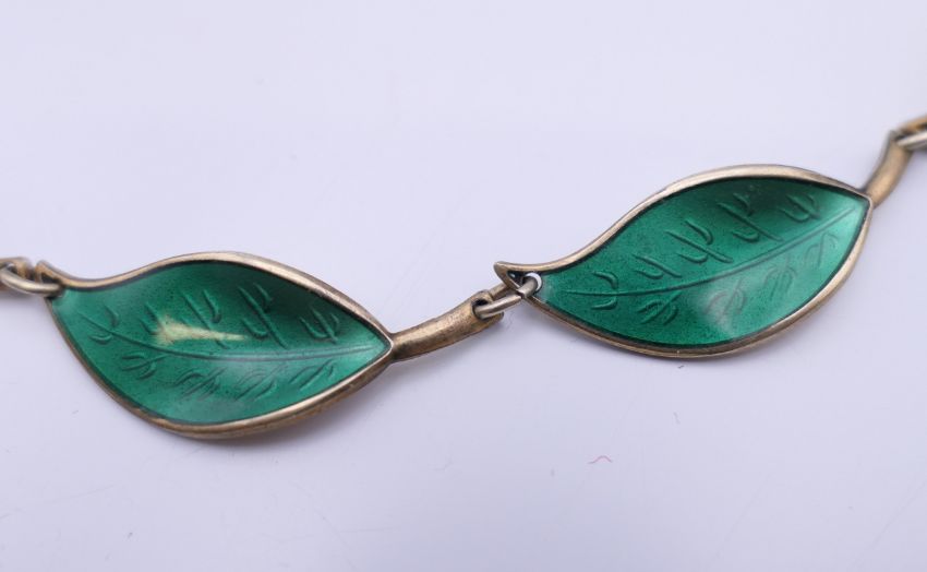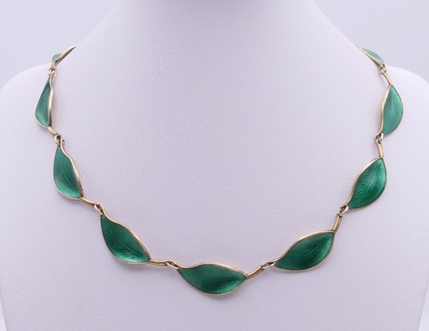 A David Andersen green enamel and silver leaf form necklace. 40 cm long.