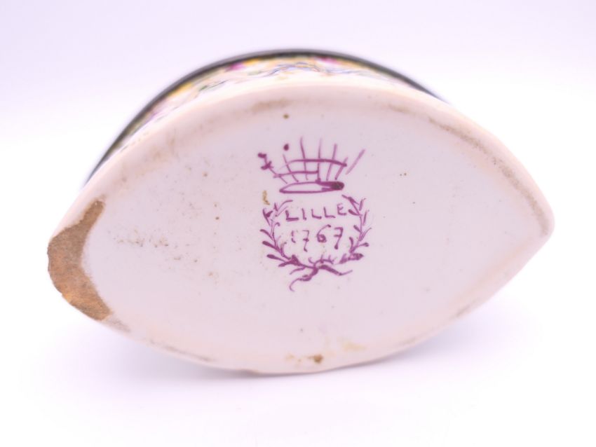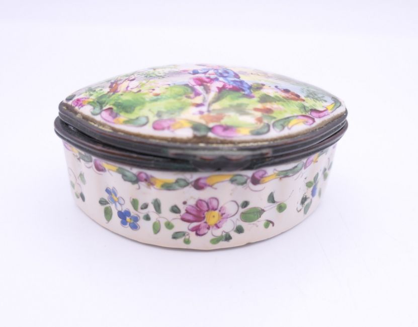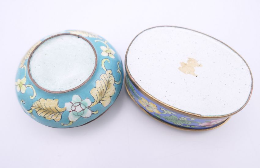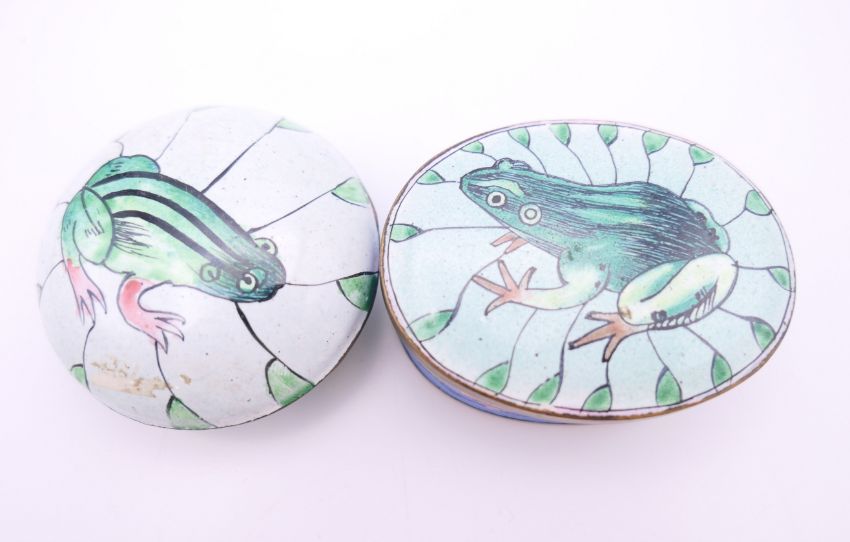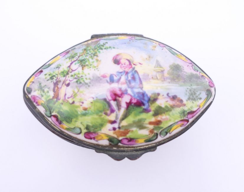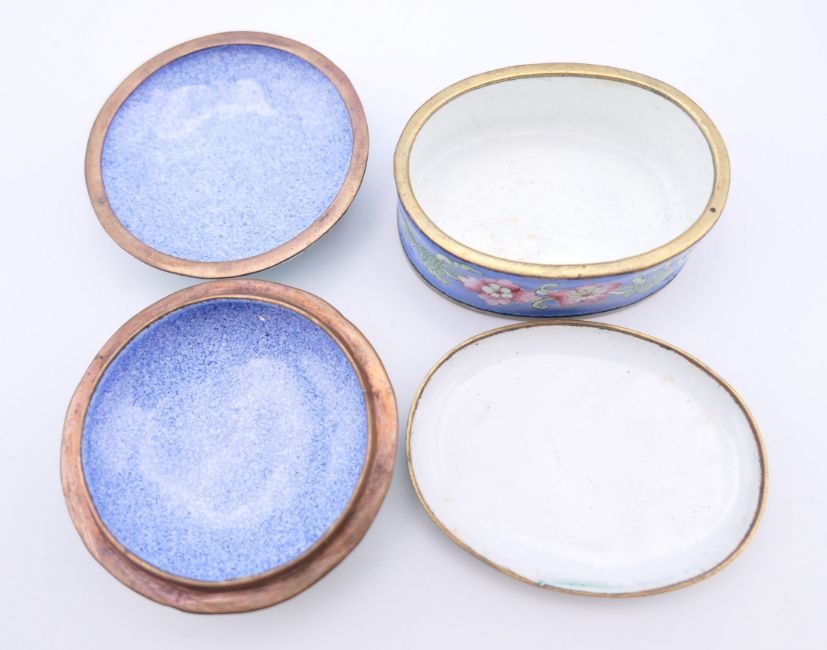 A quantity of enamel and other patch boxes, one marked Lille 1767 to base. Lille box 7 cm long.
