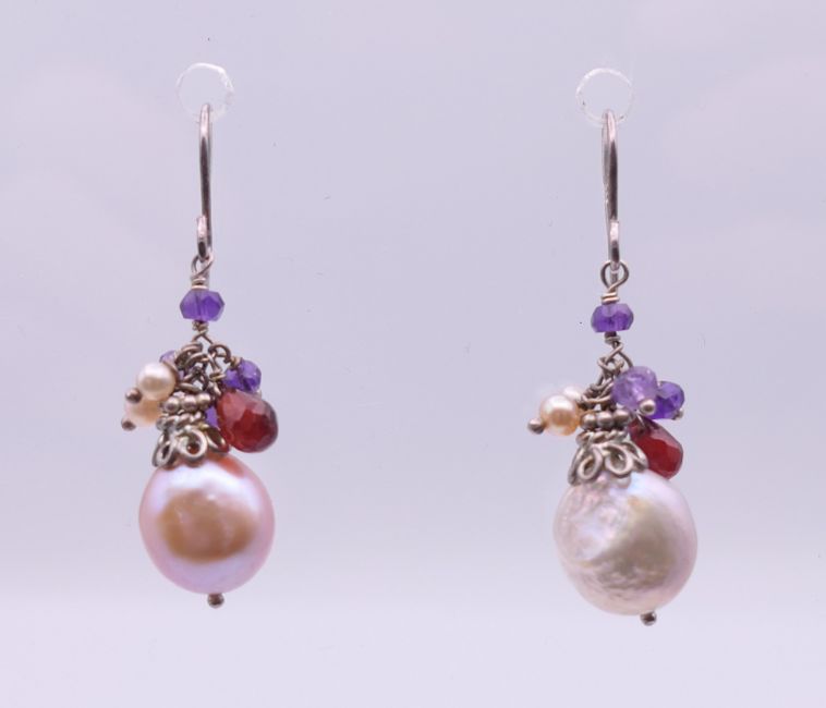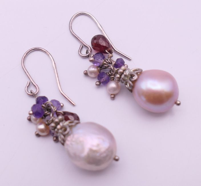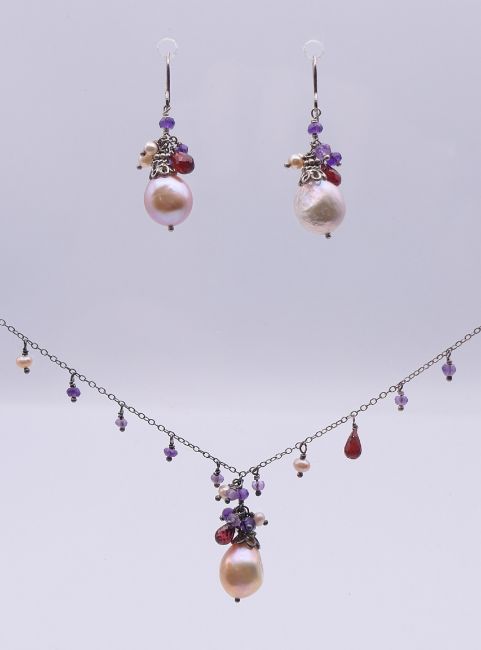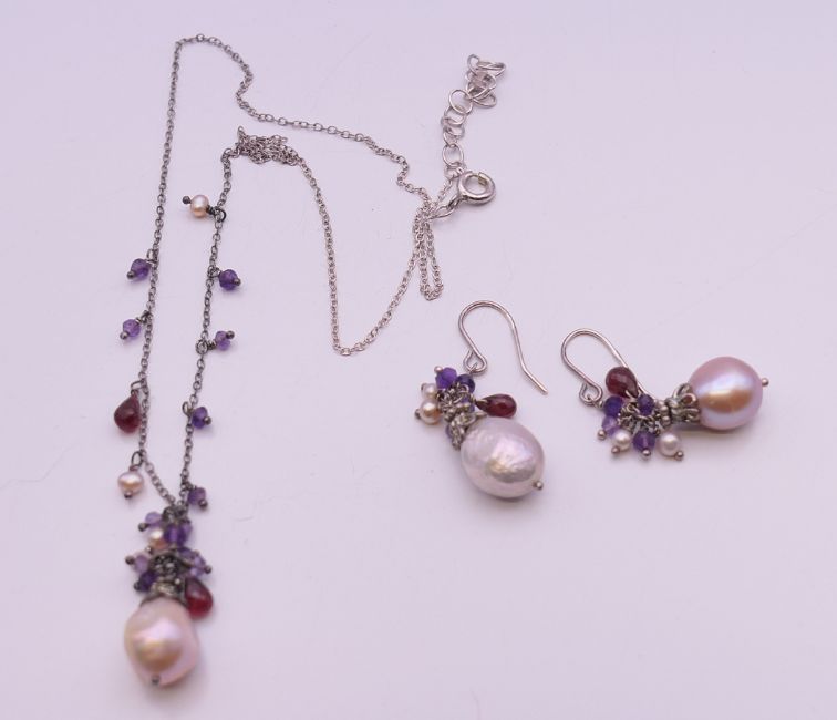 A pearl set necklace on a silver chain and a pair of matching earrings. Necklace 45 cm long, pearl drop 2.5 cm, earrings 2.5 cm high excluding suspension loop.
