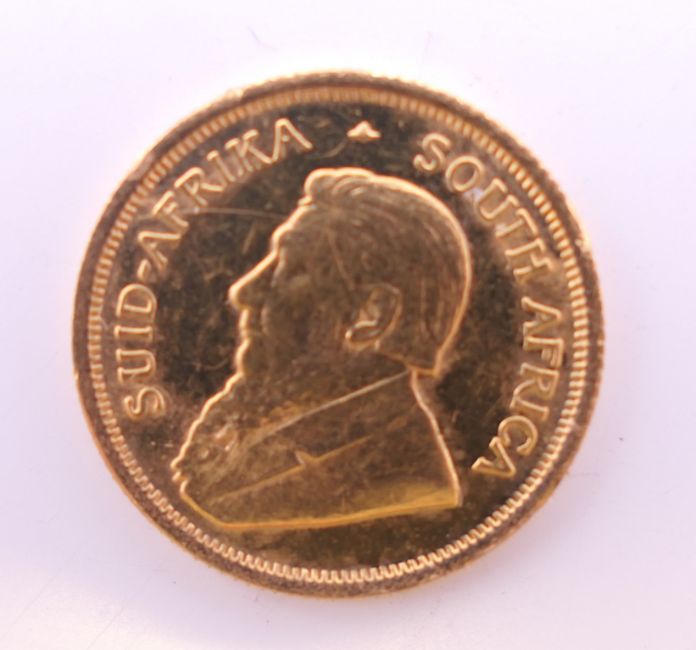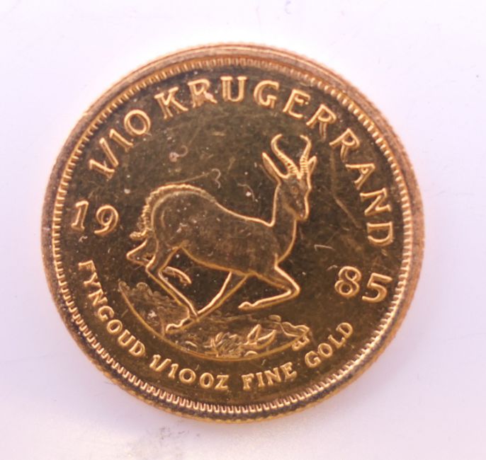 A 1985 1/10 ounce fine gold krugerrand coin.